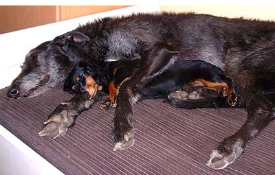 Dachsie Simone Snuggles into Xantha (Scottish Deerhound) by Jacqueline Wagener - Nederlands |