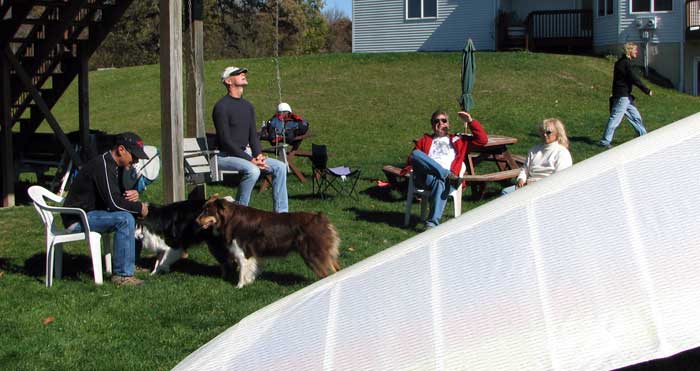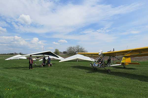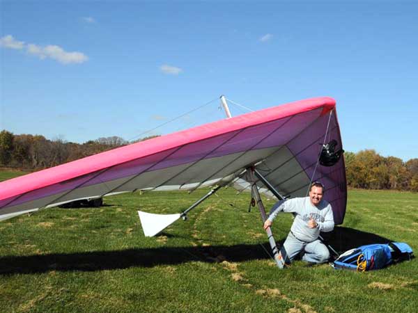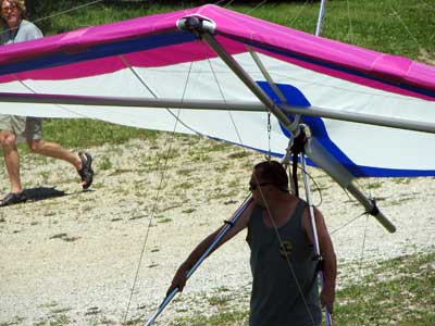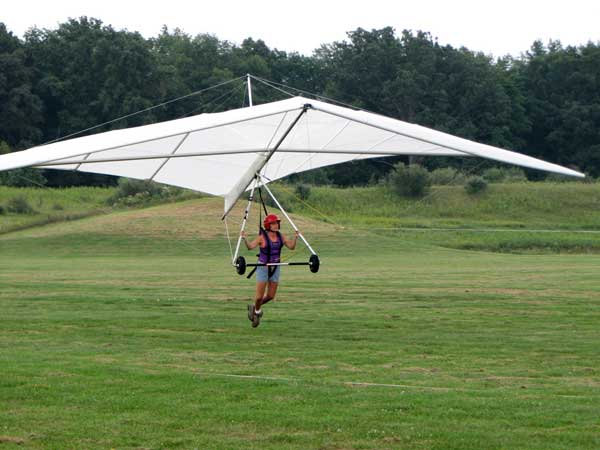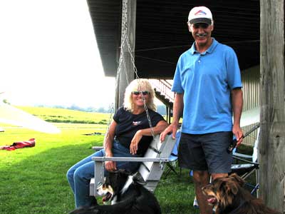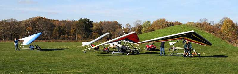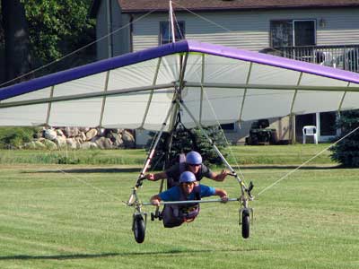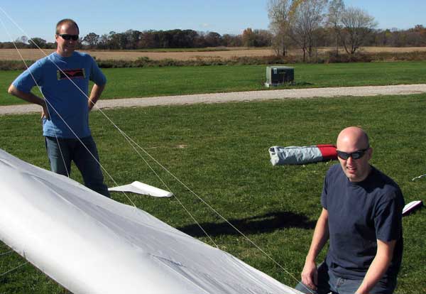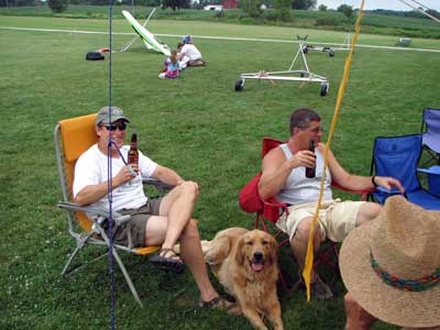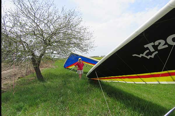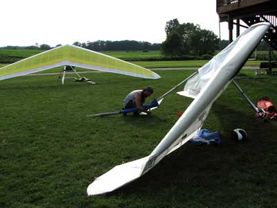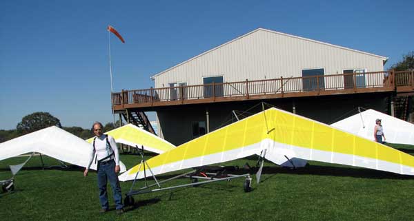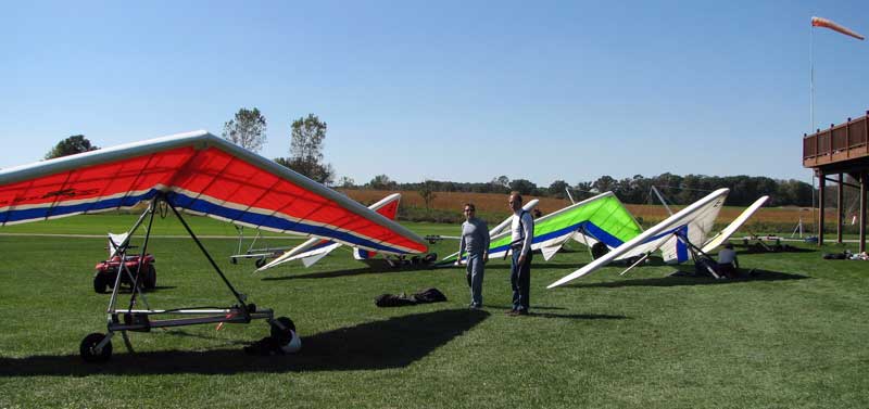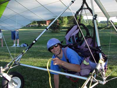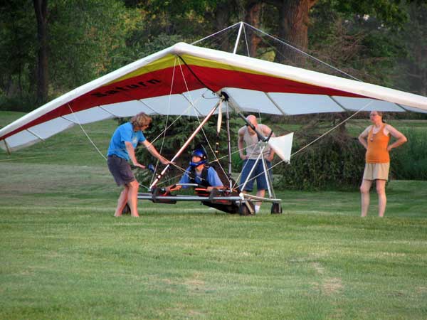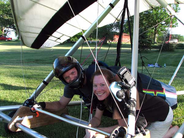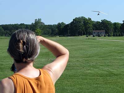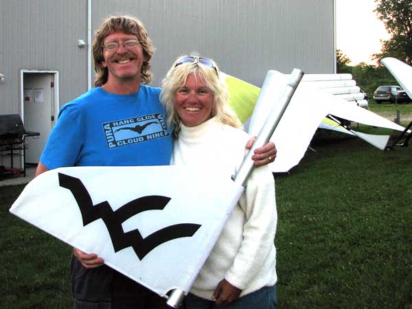First 2010 Weekend at Cloud 9 - May 15-16, 2010 Our first flying weekend at Cloud 9 in Michigan in 2010. The first two weekends in May this year were to windy or raining so we had our first great weekend on May 15-16 and a wonderful weekend it was. Saturday morning dawned with high overcast and about ten of us were not expecting to much in the way of lift. At 1 pm the gang got in line for a try and Brian got off first with his Litespeed and Wow, Brian was thermalling so others quickly got off and had a go at it. Most pilots were lucky enough to get thirty minute flights only to get flushed between the lift. At 4 pm I noticed that two pilots were staying up more easily so I jumped in line and Tracy towed me up to a nice thermal and sure enough there was lift although the sky was mostly overcast. I was lucky enough to stay up for 1 hour and twenty minutes and some others got over two hours. Saturday evening Tracy and Lisa gave instruction to a couple from Nashville Tennessee. Photo Below. Sunday morning started with lots of sun and east winds around 12 mph so Chris Christophersen got out to the start point and others followed and Lisa was ready to tow so Chris took the first tow and after doing OK finally sunk out and lots of us were trying to stay up. I got 35 minutes on my first flight and immediately took another and this time the thermals were cooking and the wind had slowed down to about 8 mph so staying up was much easier and about ten of us were having a great time in a cumulus filled sky. We got up to 5,400 feet and Chris Christophersen went downwind to Mason airport 15 miles away. I stayed up two hours and Mark Dugan and Chris Bratsis landed last at about 6:30. Lots of happy faces filled the landing area and the stories were exciting. This was a great weekend for our first flying at Cloud 9, 2010. |