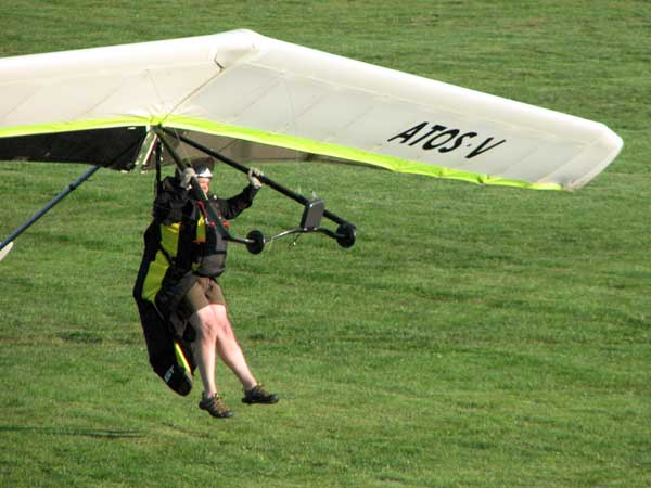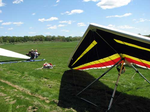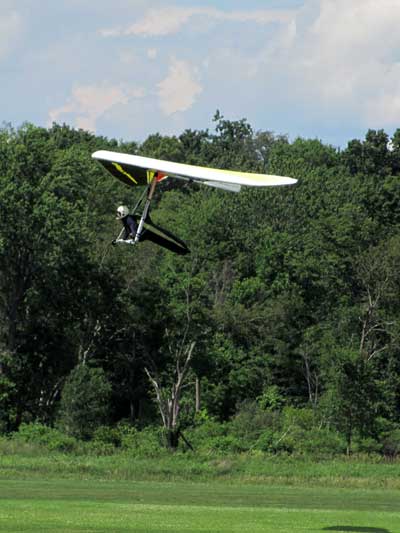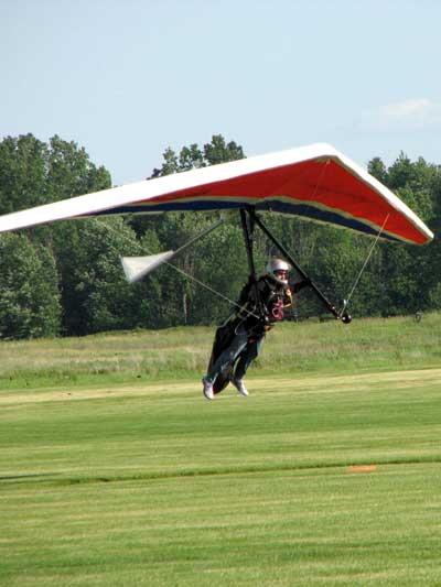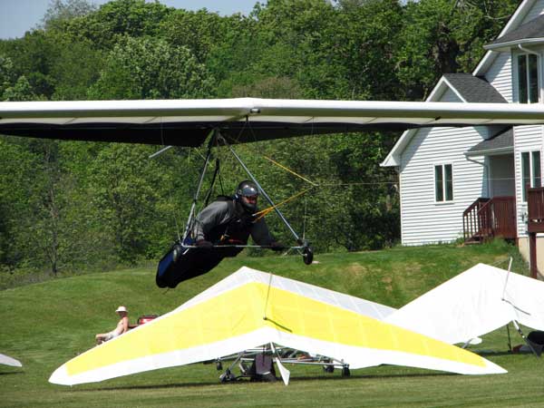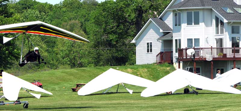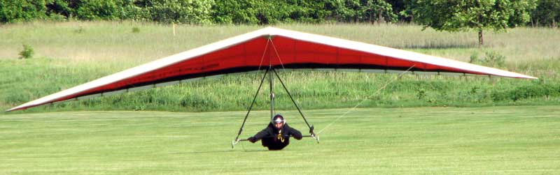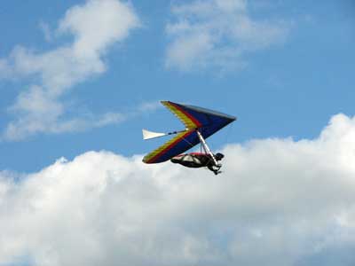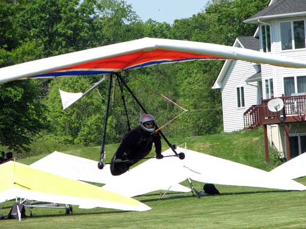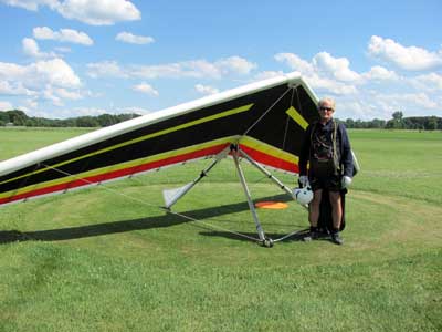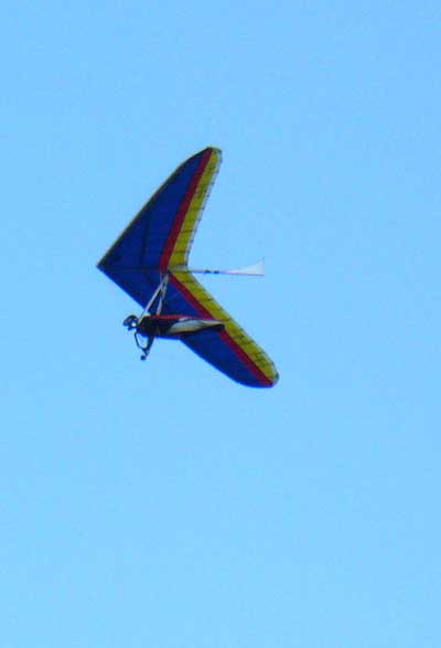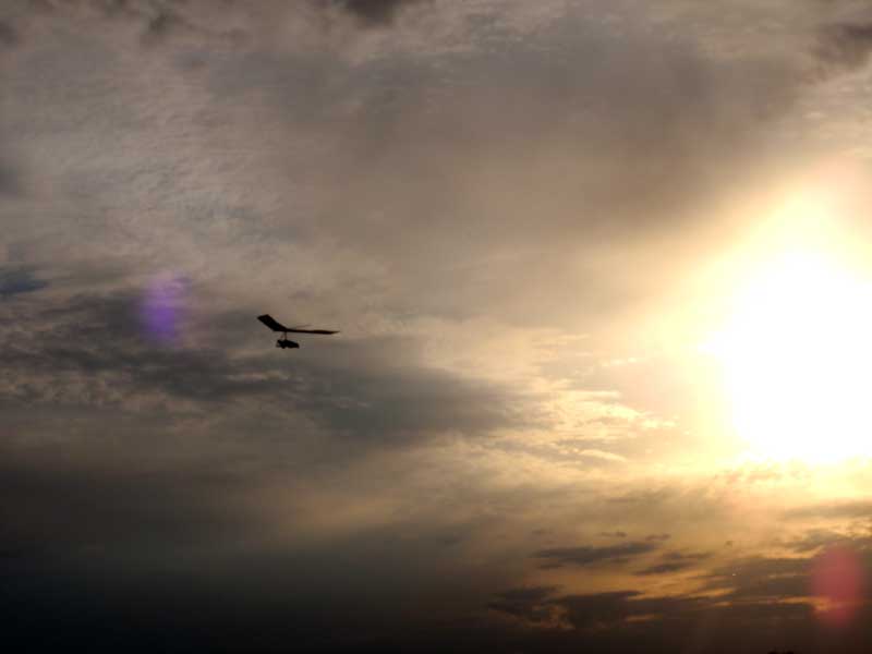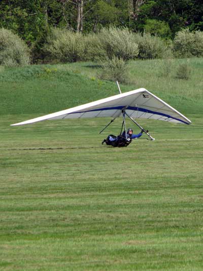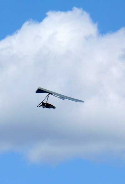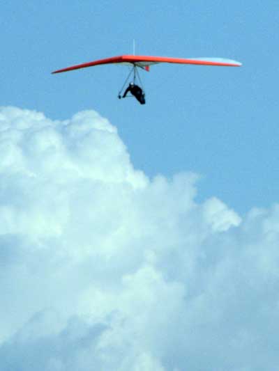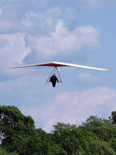 The Skydog Report Friday is a blue sky day and Scot Maue gets off first and I go next and I see scot getting down to a thousand feet while I get towed to 2,500 feet and Scot comes in under me and I use his thermal and we finally get up to 3 grand and go searching for more and while doing so I get down to 600 feet but get lucky and find a thermal that takes me out of the hole and back up to 3 grand again. Scot and I take turns getting above each other and after an hour and twenty minutes I see Trevor Glidersleeve and Chris Christophersen getting ready to launch and they both get airborne and Trevor joins Scot and I for a few minutes and then heads south and finally sinks out and then Chris joins me and we work some lift above a tractor that is working the field below and we both get above 3 grand and finally Chris heads south to the landing field and barely makes it into the north end of the field at Cloud 9 and then within five minutes I squeak in and make a perfect spot landing for a flight of 2 hours and 30 minutes. Scott did 2 hours and Trevor did about a half hour and Chris must have done 45 minutes. It was a really nice blue sky day that was very challenging. Saturday, another blue sky day and Jim and Marzena Gibson pull in around 11 am on their way home from Virginia. I took three flights and finally on the last one at 4:30 I got a 1 hour and 13 minute flight up to 3,995 feet along with a 13 minute and a 26 minute flights. There were lots of pilots and a few did well but the sink areas were pretty big so lots of sledders. Mark Bolt visited for the day riding his new Kawasaki 650. Pilots for today were Brian Deimling, Trevor Glidersleeve, Chris Bratsis, Chris Christopersen, Scot Maue, Mark Dugan, Lisa Colletti and myself and then there were the tandems in the evening. Sunday was an interesting day with lots of wind. At noon the wind was 14 mph gusting to 18 or more. At 2 pm Scot Maue got on a cart and tried the air and was soon on the ground. Unfortunately I jumped in right behind Scot and only lasted 14 minutes searching over a freshly ploughed field with no luck. When I landed Scot was getting his Exxtacy on a cart again and I wondered why. When Scot was towed up this time he headed toward some haze domes that were forming to the west of the field and sure enough Scot got up well over 4,000 feet so I got ready and Tracy towed me up over the field and I headed west to the domes and sure enough there was great lift and the higher I got the faster the climbs right up to 6,000 feet. Scot later said that he registered 700 fpm. I lost sight of Scot immediately but worked the lift for forty minutes and finally saw someone else take off. I worked lift over the fields to the northeast of Cloud 9 and noticed Mark Dugan and another glider flying way below. I took the lift from a tractor working a field and took it back to the north real close to hyw. 96 and finally got up to 6,745 feet ato. Feeling like I was getting a long ways away from the landing area, I pulled the bar in and flew fast toward Cloud 9 to the south likely flying through lift that I did not detect. I got back to the field with 1,400 feet and searched and lost to a good landing twenty feet from the spot. Trevor and Scot were there and I realized that about five others were in the air still and as they landed a half hour later it was evident that there was still lots of lift at six pm. Mark Dugan later old me that he finally got up to over 6 grand and that he was north of Fowlerville and that he had seen me way below as I was racing back to Cloud 9 Field west. Sure do wish that I had slowed down and caught more lift which may have extended my flight time by almost an hour. Chris Bratsis dropped in last and was excited with his great flight. My flight time was 1 hour and 38 minutes and most pilots got around two hours. Pilots for today were Brian Deimling, Trevor Glidersleeve, Chris Bratsis, Chris Christopersen, Jim Dedes, Scot Maue, Mark Dugan, and myself Dan Maslanik (Guido) helped launch on both days and Tracy Tillman towed solos on all three days and Lisa towed the tandems Friday and Saturday. |