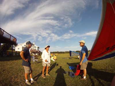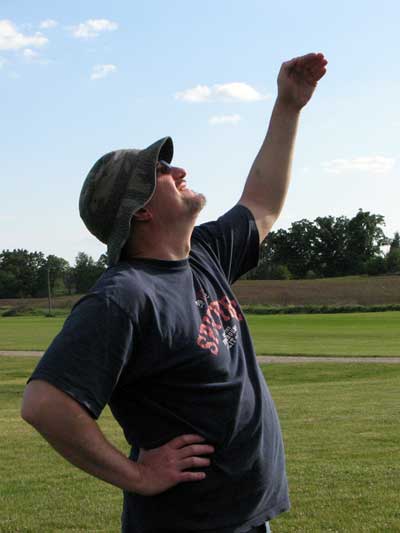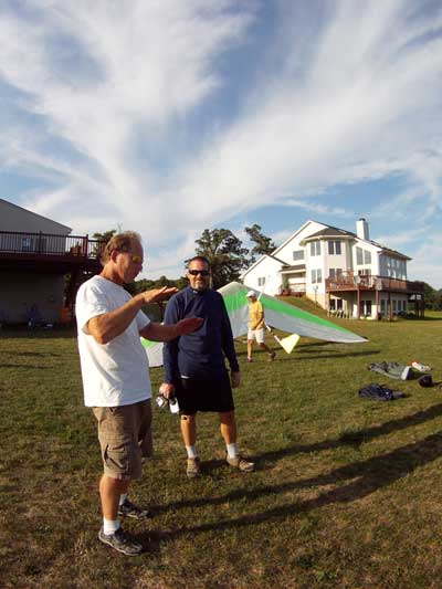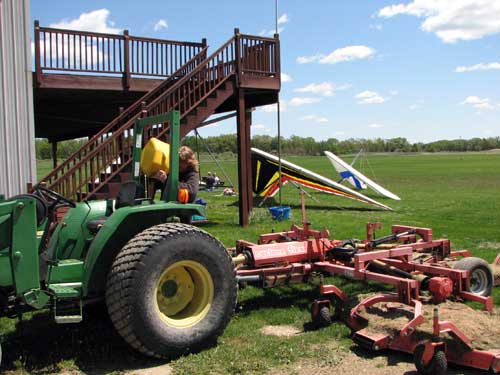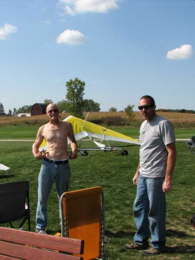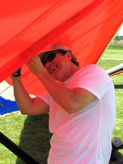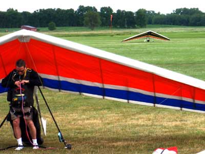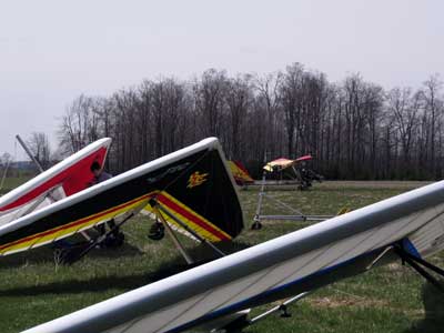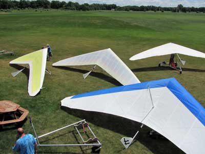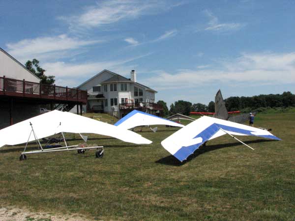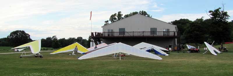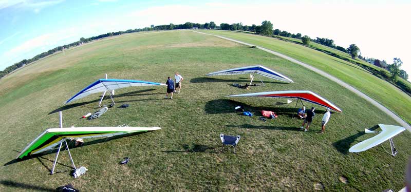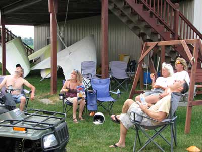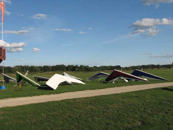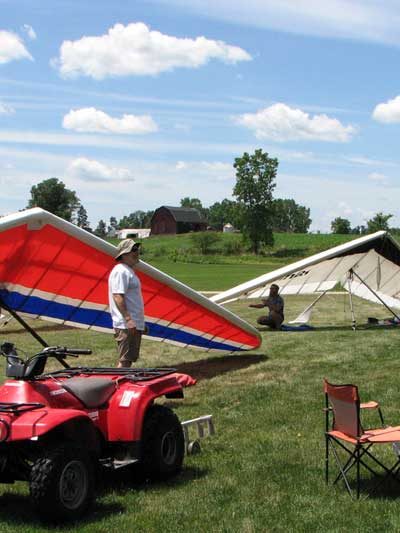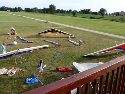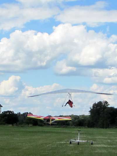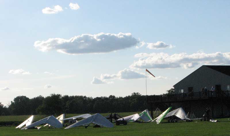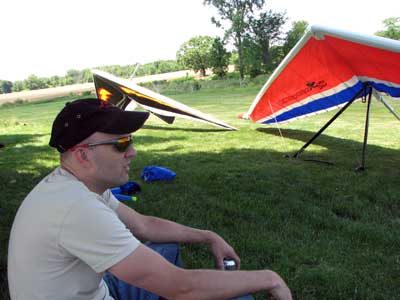 The Chris Bratsis Report Sunday July 1st. was my first flight since your & mine epic flight from a week earlier. In the morning the soaring forecast looked really good. Mark Dugan called to see if I was up for flying and I said, "Jeez! I guess"! So I packed up and headed to Cloud 9. On the way I got a call from Trevor Gildersleeve who was in Grand Rapids and said it was raining there. Once at Cloud 9, Dugan was just setting up, I stopped him and we went to check the radar and sure enough a "blob" of green was heading are way. We were bummed out and quickly put the glider bag on Marks wing when the drops started. Strangely enough hardly any rain fell but the cloud cover was still there but moving east so we waited and shot the breeze with Tracy & Lisa, Jim Dedes, Patrick O'Donnell & his wife Pauli, Tom Niblink and his wife pulled in a short time later. It was about 2:15 pm and at this point and the sky was clearing so we started to set up our gliders. It was very hot and the wind was out of the north west so we headed to the southeast corner of the field to launch. Jim Dedes launched first then myself followed by Mark Dugan. Jim seemed to be maintaining and Tracy dropped me off in a nice thermal northwest of the field. I was struggling with my harness zipper but said "screw it" so I wouldn't loose my concentration. This would be a good thing as on past flights I fought with my zipper and by the time I figured out the problem I had lost the thermal. Not this time! I was still struggling trying to stay in this thermal and saw Mark a bit west at my altitude so I decided to work where I was so Mark &I would have options for each other. Reflecting back I should have slide under Mark cuz he ended up way over me. I did not want to let go of the lift I had which was strong but narrow & snaky. As luck would have it , I was able to hold on and once above 3000ft the thermal expanded and turned ON and I was finally able to meet up with Dugan at 4500ft. All this time I could not close my harness zipper and was getting tired of holding my legs in when I discovered it was my unzip cord that was caught so I was able to free it and I was able to zip up. It made a huge difference and now I could relax. But because of this I was unable to climb to cloud base with Dugan around 5000 ft. So Mark & I were south east of the field and we were watching the action below us. It seemed as Jim Dedes had landed. Patrick, Lisa Colletti & Tom all were getting flushed. Mark & I apparently had the very short window and were able to find the lift line south of Cloud 9 field. I felt I was getting too far south and started to head back looking for lift on the way but it was spotty & light. Mark was behind me and as we were arranging our approaches Mark found a bubble while I landed. He extended is flight for another 15 minutes. We both ended up with 1.5 hours and made a decent day of flying out of what looked like a washout. Another fun day out at Cloud 9 |