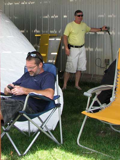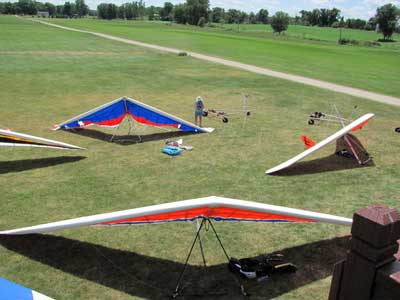 The Skydog Report July 5 & 6, 2012 Wednesday around 3 pm Rick Hines met us a Patrick's home and we loaded up for a two day trip to Cloud 9 and this would be Rick's first time at Cloud 9. We arrived around 7 pm and set up tents and got ready for a good two days of flying. Thursday's forecast was promising and we got our gliders out to the South end of the field around 1:30 but as we waited for the tug the wind picked up and a gust front along with a storm moved in very quickly so we towed the gliders back to the hanger and gave up on Thursday. Friday's forecast looked real good and Mark Bolt drove in around 9 am and set up an old glider that he had been keeping for a few years called a TRX. It looked like an antique. Rick Hines had to get back to work Friday evening so he has to leave by noon and did not fly but will come back next Tuesday weather permitting. Patrick Mark and myself took tows at about 1:30 but I only lasted for 20 minutes and we were all down quickly. The three of us took second tows at 3:30 and this time we all stuck and Mark and I stuck together for over an hour getting up to 4,975 feet. Mark then streaked off to the north and I lost track of him for a while but later saw him and Lisa who had launched last over to the north west so I chased them and caught up to them and thermalled with Lisa for a half hour at about 4 grand. It is always fun flying with Lisa who is another great pilot and she teaches me a lot about where to go and finding the lift. Patrick had a great one hour flight and got up to 4,300 feet making two great landings today. Around 5 pm there was a hard sink cycle and the others all landed but I found a bubble at 1,300 feet and took it back up to 3,800 feet and noticed that Floyd Cadwell and then Chris Bratsis were being towed up and Floyd joined me for a few minutes and then I made a mistake and finally lost the lift and landed after a 2 hour and 10 minute flight. Floyd and Chris both had a over one hour flights in the 95 degree heat. This finished off our two day trip with a great feeling of joy. My 2012 Airtime is 78 hours and 39 minutes as of July 6, 2012 |