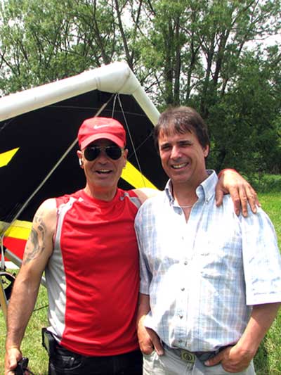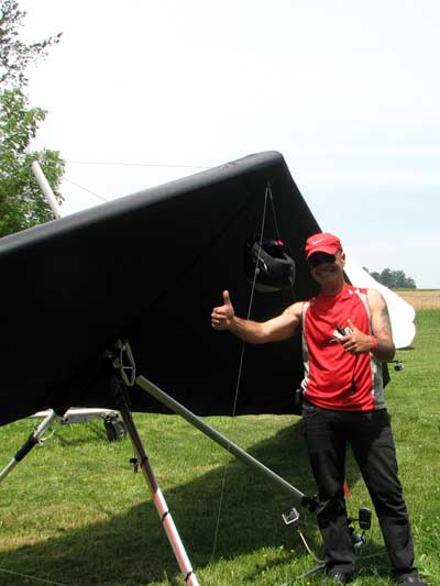 The Skydog Report Saturday June 15, 2013 Ken called and said that today might be OK so I headed north to Arthur, Ontario and arrived at noon and found two new to me pilots already set up. Gazi and Mark from Oshawa and Whitby had arrived at 9:30 not realizing that we don't start flying until one pm. Ken was also already there and partially set up so I got my glider together and by 2 pm we were ready to fly and I suggested that ken go first as he usually stays up. There was lot of cloud cover to our south but some blue at the field and Ken hooked a good one and I was off next and Steve towed me to a nice thermal and I followed it across and past the field about two miles and worked my way upwind again hoping to find another one and I did and took it back and worked ahead again and lost it and landed after 25 minutes. I had gained up to 3,000 feet ato on the first flight. Kenny was still up so I had Steve take me up again and I repeated the exercise again lasting 20 minutes this time and Kenny was still up there so I took off again and chased Kenny around the sky and finally I saw Kenny landing and I survived for another ten minutes making my last flight 28 minutes and this time I had got up to 3,200 feet. Gazi took a late flight on his new Wills Wing U-2 and stayed aloft for fifteen minutes. A challenging day and Kenny logged one hour and twenty minutes in one flight. Kenny is amazing on his new Wills Wing T-2-C. |