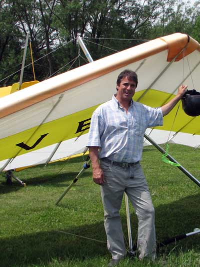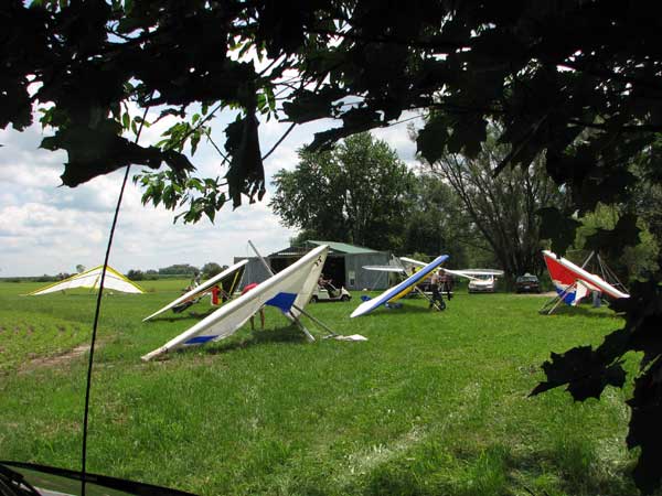 The Skydog Report Comp weekend, August 3,4 and 5 and Saturday started the weekend with winds over 20 mph and I took a early flight at noon when the wind was likely 15 mph on launch but in the air it quickly changed to 25 mph. There were beautiful cloud streets and I was able to use good lift o base at 3,700 feet and then stayed with it until I drifted past the landing field and then worked upwind again and under another good one and while taking it up close to base I decided that his was just to windy and bumpy so I headed back to the field and had a good landing for a 23 minute flight. Thinking about it later, I wished that I had stuck it out for at least a half hour but here I am safe on the ground again. Steve Younger took the tug up an hour later and reported that the wind had picked up even more so no one flew until after six when Dan Spier ha a short flight on his Atos. The day was filled with lots of happy faces and pilots and families enjoying the beautiful day. Sunday turned out to be even windier and I did not attend but Monday's forecast showed 7 ph wind so I drove north again and found that most of the gang was still there and as I drove in at 10:30 I saw a glider being towed up. Sunday turned out to be a wonderful day with great cummies and lots of lift. A triangle task was called and many of the 22 comp pilots tried it but most landed short. I hear that ken Kinzie won the day with a 24 mile flight around the course. Steve Bellerby had the longest flight of the day with six hours and eight minutes flying close to base most of the day. There must have been thirty pilots and most had exceptional flights. Seven pilots from New York State made the seven hour drive and we really enjoyed their company. OK so my flights on Monday were a 16 minute flight to base at over 5,000 feet and then to the ground in a sink hole and then I waited 3 hours in the line up and took another great tow by Steve and bam right into a boomer that took me to 5,300 feet and base again. I worked under this one for about twenty minutes and then left hoping to find another boomer but only found mediocre broken lift up to about three grand. I flew around in this stuff for another forty minutes with six other pilots and finally I was on the ground again with a 1 hour and 2 minute flight. I was a great weekend seeing old friends and meeting new ones and having a blast in the air. Thanks to all those who organized this great event. |