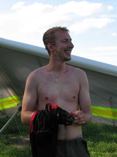 The Skydog Report Thursday August 23, I arrived around 11:30 so I rushed to set up and get ready to fly. Terry Ryan, Eric Cloverdale, Ken Kenzie and Nick Jones were setting up and later Milco Angulo and Don Vermeer showed up. Steve towed us up around one o'clock and I immediately went to cloud base at 4,700 feet and up the face to 5,045 feet. There was ample lift everywhere and a bunch of were thermalling together and Eric stayed close for a while playing at base and finaly Milco got away from me and I could not find him anywhere as I had planned to keep close on his path and I surely wish that I had as Milco logged 4 hours and 45 minutes and I landed after 2 hours and 10 minutes. Eveyone had more that an hour and Eric di a personal best of 2 hours and 16 minutes. Another great day at Soga Field. |