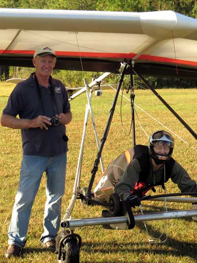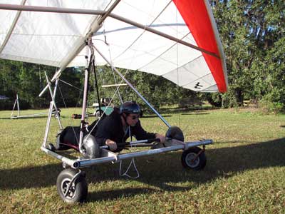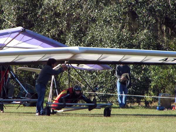 The Skydog Report Saturday November 28th I drive to Oded Kalir's home in Branchport NY. and Jimmy Kolynich from Elmira meets us there and we load up for a trip to Florida with our gliders and Jimmy has a new Atos VRS. Our 22 hour drive is uneventful and we arrive at Wallaby Ranch at 4 pm Saturday in the sunshine and 72 degree day. I set up and take a 22 minute almost sledder after we hear about some great flights during the day, one of which was a 3-1/2 hour flight by Tyson Richmond. Sunday dawns clear and the tandems go smoothly and Jimmy and Oded both take refresher flights and Jimmy uses a Falcon to refresh on his towing skills. By 1 pm the cummies are starting and Bertrand takes off first and stays up for a while so I get into the air with Paul Harrison towing me. I soon join up with Bertrand and Eric and we are in the same thermal for a half hour or so getting pretty close sometimes. Jimmy took four tows on the Falcon and is ready to try his new Atos VRS Monday morning. Oded took a second tow but to late and had a 20 minute glide. I took three tows and lasted 37 minutes, on the first one and 45 minutes on the second and 15 minutes on the third getting up to 4,600 feet and base on my first flight. On my first flight I went to far west and barely made it back to the Ranch. Bertrand and Mitch had the best flights of the windy day with over two hours each and Bertrand took three other flights Sunday. Bertrand's wife Sammie also took a flight early and did very well. There must have been fifteen pilots up on Sunday having varied success at staying with the fast moving lift. |