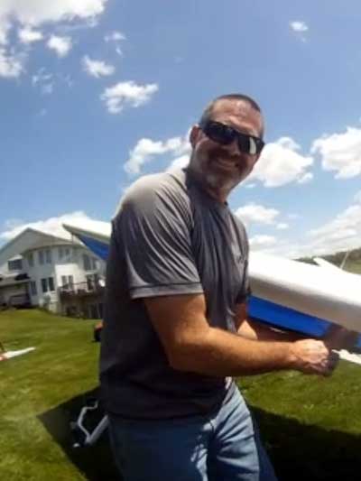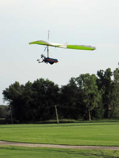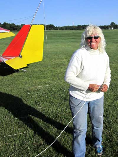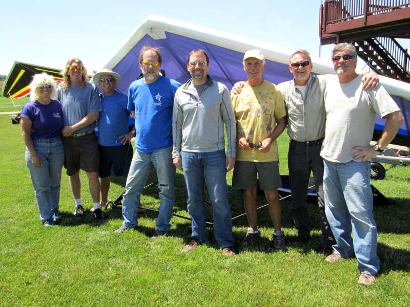 The Skydog Report Friday July 18, 2014 turns out to be another good day and Lisa gets up to 5,500 feet. I took off first and slowly lost lift and got down to 900 feet at the twenty minute mark but luckily I caught a thermal just south of the field over a wheat field and I took it up to 3 grand. By this time Mark Dugan, Jim Dedes, Lisa Colletti, Owen McDermott and Marty had launched. When I climbed back up to 3 grand Lisa was at well over four grand and Owen was just above me so I worked the lift for a half hour and finally I only had Lisa above me and Mark Dugan had gone XC. I chased Lisa around the sky for another hour and finally caught up to her and by then most were landing and Lisa went in for a good landing and then Jim slipped in just in front of me and I landed on the target right behind Jim so we were both sitting in the circle. I had a 1 hour and 54 minute flight and up to 4,885 feet ato. Around six pm Mark called and Jim went to pick him up about ten miles out. Mark had gone 20 miles north and was on his way back when he landed. Friday July 19, overcast at 8 am but by eleven am there are lots of cummies showing up so Scot Maue is setting up his Exxtacy. Clouds move in again and then at 4 pm it clears some so Trevor and Marty take flights but neither stay up so on to the tandems for the evening and they go well. Saturday July 20, is a sunny morning that appears to be a good day coming. Tracy takes the Alatis down and prepares it for flight and at 2 o'clock Lisa tows Tracy up and Tracy sticks nicely. Brian Deimling, Scot Maue Brian Ridder, Mark Dugan, Chris Bratsis, Trevor Glidersleeve and myself head to the south east corner of the field and Lisa tows us up into a cummie filled sky. I am third off and Brian and Scot are ahead of me, Scot with my GoPro camera. I drop off at 2,500 feet and find good lift and work it up to Scot and we fly together for a few minutes and then Brian Ridder joins me and Brian Deimling is way above us at base. Mark Dugan catches up to us a few minutes later and I chase Mark around for a while and then Mark heads off to the south and I decide to head west. I find a good line to the west and soon I see Tracy in the Alatis coming toward me in a thermal so I join in and we take it to base. Tracy takes off to the north and I head over hwy. 52 to get a photo of the R/C field and in doing so I find strong sink and head back toward Cloud 9 field. I just make it back and get down to 500 feet above the field when I hit a bubble above a freshly combined wheat field and I am able to work it up to 1,100 feet but I don't follow it back far enough and soon I am down to the landing process coming in and just past the spot with a flight of 2 hours and two minutes and a best height of 5,091 feet above the field. Now I see that three pilots are still high so I ask Lisa to tow me up again and I get off at 2,500 again and go searching and find myself a way off to the south and I barely make it back to the field for a 23 minute flight. A half hour later Brian Deimling is landing and then Tracy Tillman comes in and almost stops the sailplane on the spot. What a fantastic day of flying and Tracy has a 4 hour flight and Brian Deimling a three hour flight.
