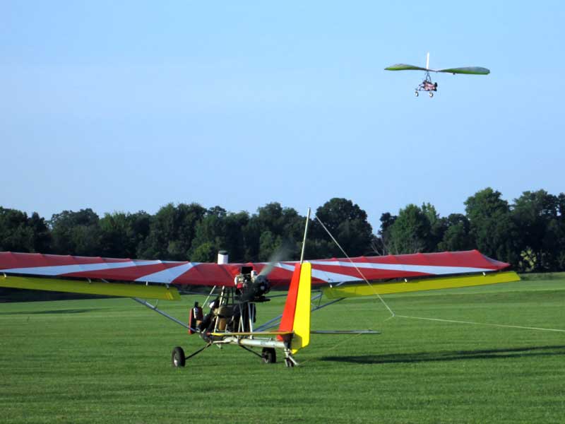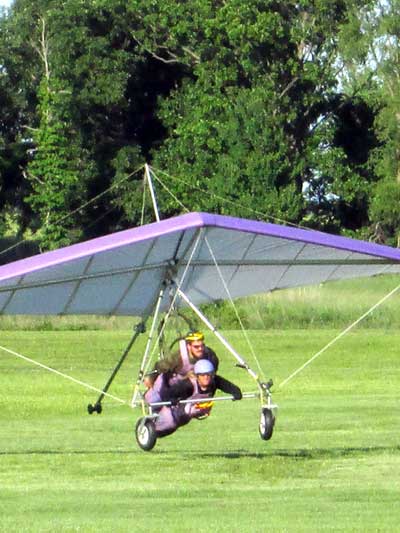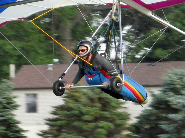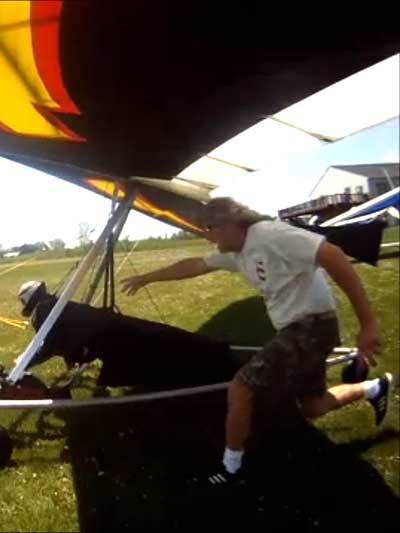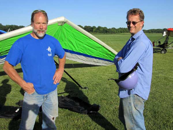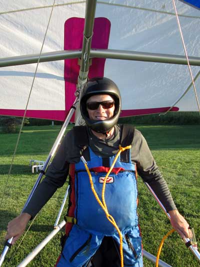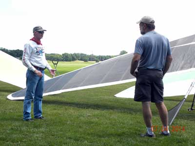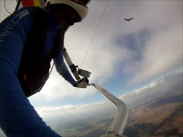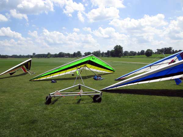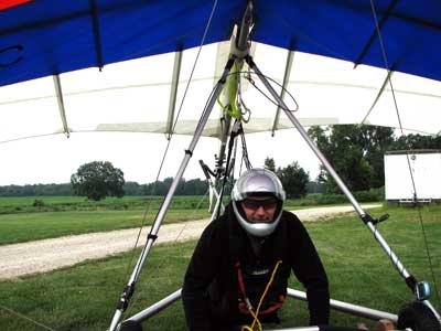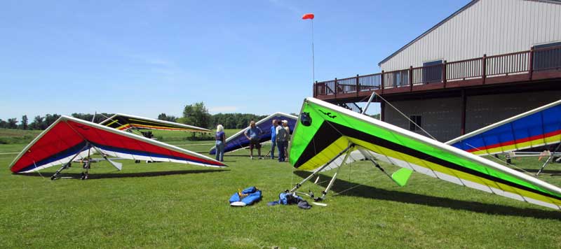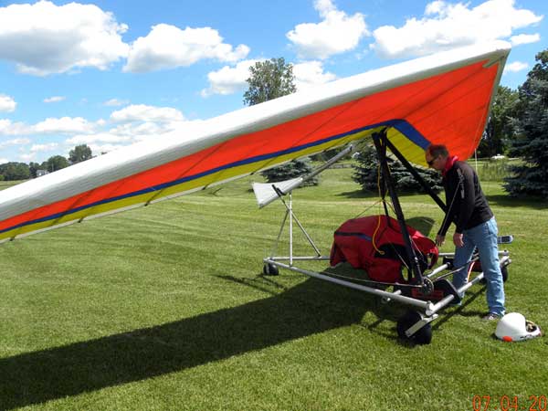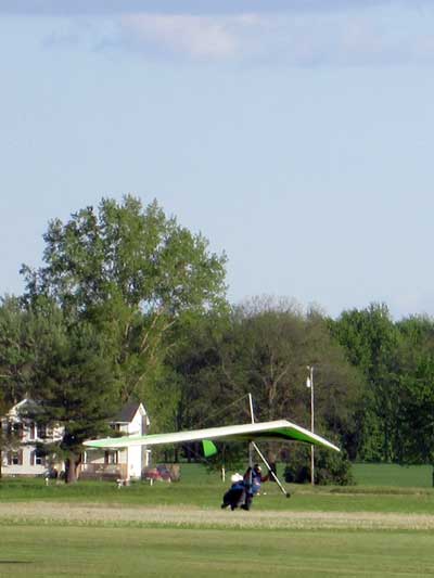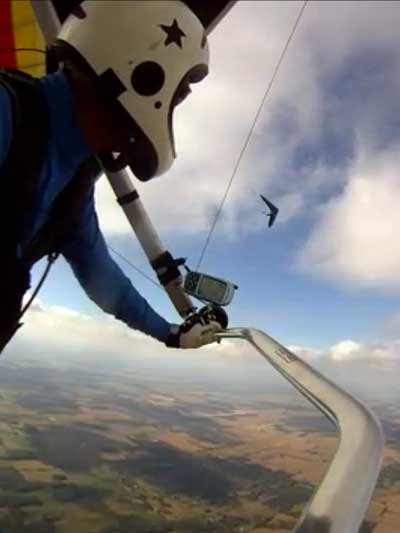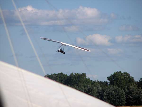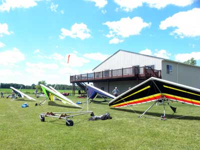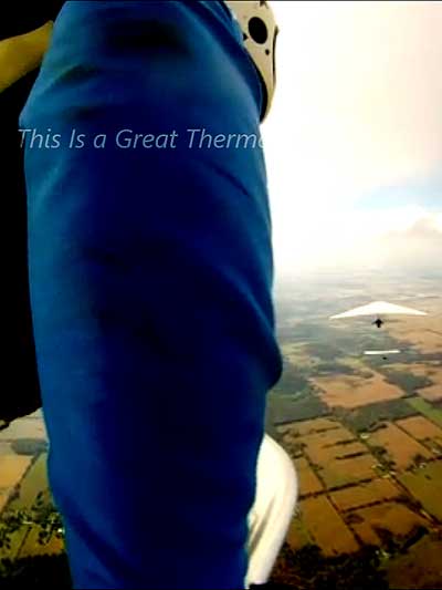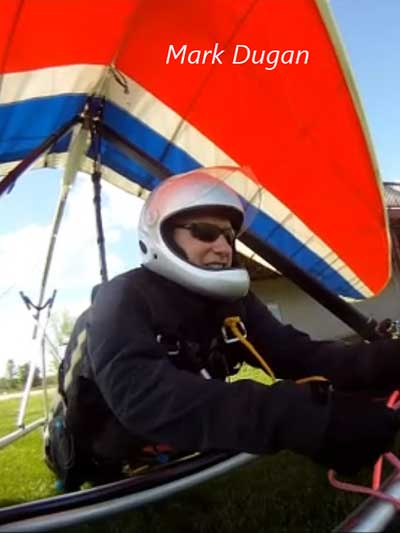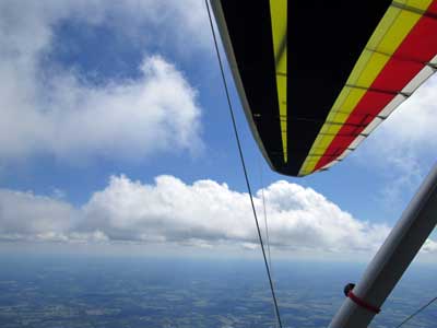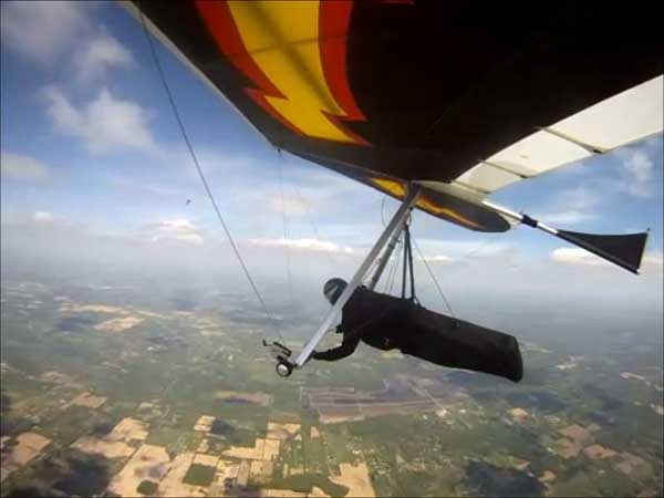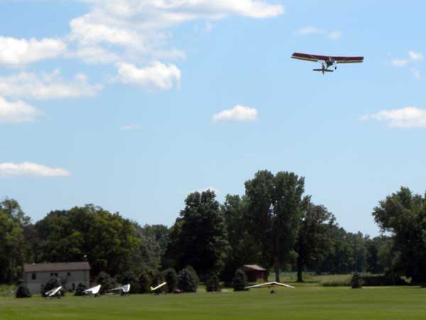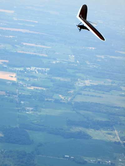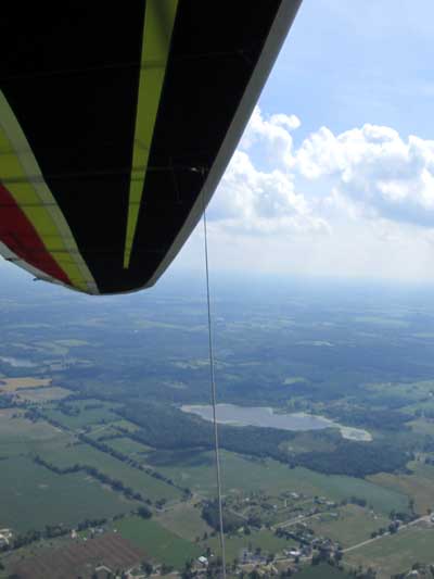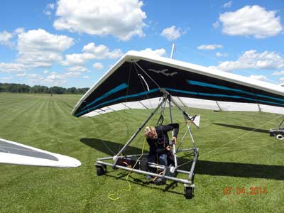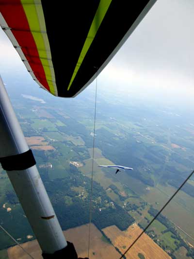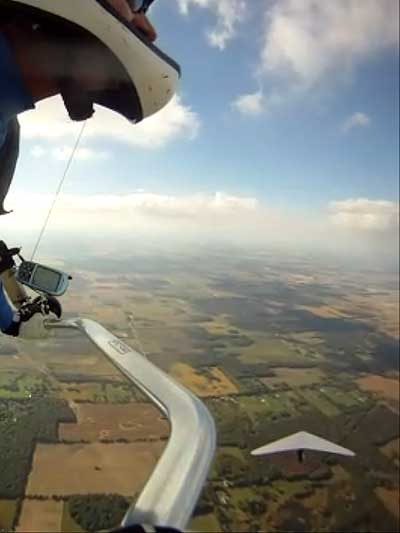 The Skydog Report Thursday June 30th Patrick O'Donnell and I drove to Cloud 9 with a forecast for partly cloudy with wind speeds up to 10 mph. Well, half way there near Flint Mi. it rained really hard for a half hour and then cloudy skies. As we approached cloud 9 field we could see clear skies coming close by so we felt less dejected. We organized our stuff and set up our gliders, Patrick with his new Wills Wing Sport 2-135 and me with the seven year old T-2. We finished setting up by 1:30 and by now the wind had picked up to 12 gusting to 18 so we parked the gliders in the shelter and made the best of what was now a sunny day. Around four o'clock Bill and Marylyn Soderquist, California pilots drove in and set up their beautiful motor home and we chatted with them and heard so many wonderful flying stories from Bill. Friday July 04, 2014 in the morning we have a forecast for north winds of 10 mph and sunny skies and by 10 am the wind is blowing up to 15 mph so we are pissed. Lots of pilots show up for the fourth of July so we are all set up and finally at 2:30 I see the wind is settling down to 10 with thermal gusts to 15 so I get my glider out and go the south end of the field with about ten others following me. Lisa comes down with the tug and tows Mark Dugan up first as I am waiting for Patrick so that I can start the GoPro camera. I am next and I have a have a weak link break at 15 feet so I hurry back to take off and Pat Winther goes next and then I get back in line and Lisa tows me up and I make it through the first rough patch but at 1,200 feet I break the weak link again but find a decent thermal and after eleven minutes I am at five grand and so happy to have got up from 1,200 fee ato. The air was rasty but the climbs were strong and very enjoyable. Brian Deimling came up next and joined me for a bit while I was searching for Mark Dugan who is usually on the top of the stack and after a half hour I finally see Mark way above me close to base and I spend a good half hour trying to get up to his weight and throughout the flight I never did quite catch up to Mark. I did get to about two hundred feet below Mark at one point but never above him. We had followed the clouds south toward Stockbridge and beat back upwind a few times when I saw Pat Winther down below me about two grand so I cruised over top of him and after a while Pat was up with me and we spent a good half hour thermalling together sometimes getting down to two grand and then back up to five grand. I was trying to get a shot of Pat with my hand held Canon but it looks like I missed him most of the time. Pat and I were thermalling a little to close on occasion and at one point the top of Pat's sail was really close, a little to close for my liking. All the other pilots were towed up but I did not see many in the air so they must have stayed upwind far from my sight. Patrick had a nice one hour flight and had a personal best climb up to 5,600 feet. I watched as many pilots landed and now it was getting late like 6:30 and Pat and I were getting down to 1,000 feet ato and we headed for the landing field and I could see Mark Dugan a grand above us heading north over the field as I landed on the spot and Pat came in two minutes behind me. We watched as Mark caught yet another good thermal and stayed up for another half hour landing with a three hour and forty five minute flight. I am not sure but I expect that Pat got 3 hours and my flight was 2 hours and 50 minutes and I topped out at 5,808 feet. Mark tells me that he bumped to just over six grand on this really strong day at Cloud 9. Bill Soderquist did a forty mile square around the area for his first flight at Cloud 9. Dave, a new pilot took his first three tandems in the evening and it looks like Dave is going to be one of our new super pilots. Hopefully more fun on Saturday. Saturday starts out cloudy but is forecast to clear by 2 pm but does not clear up until 4:30 and Mark Dugan and Bill Soderquist and Tom get towed up and seem to be staying high as I leave for home. I had taken two tows earlier but only survived for 20 minutes and 14 minutes so the later flights worked out much better. I have not heard yet how much airtime the pilots got. Will let you know later. |