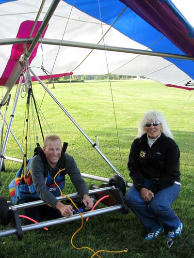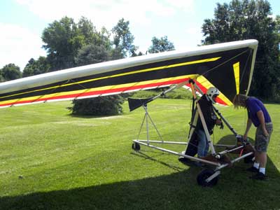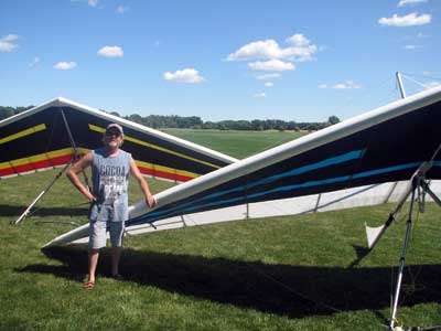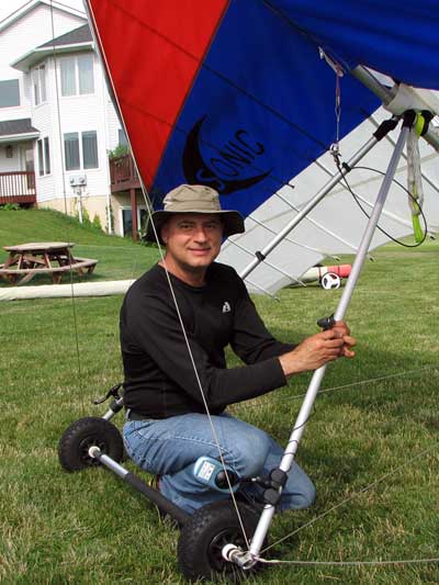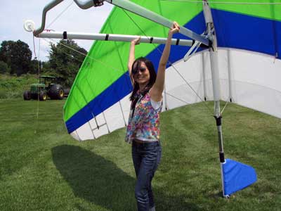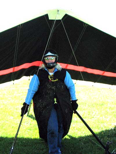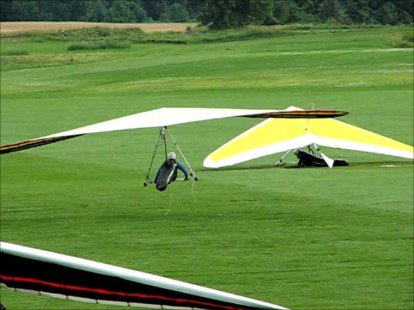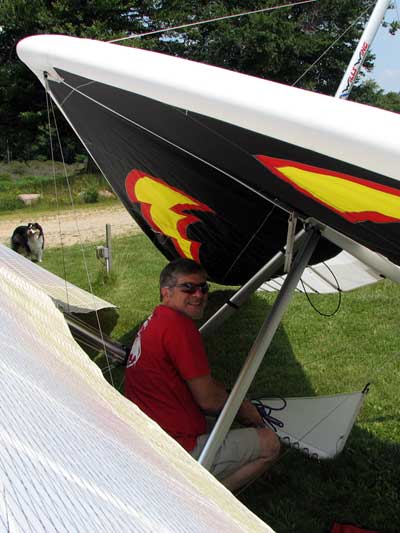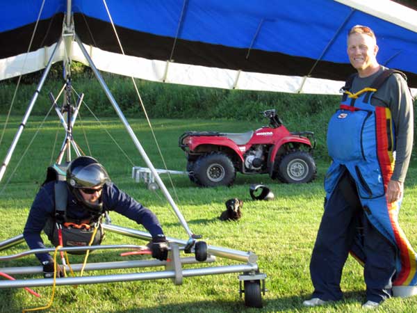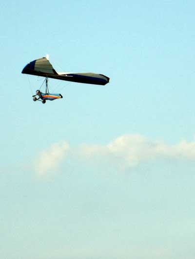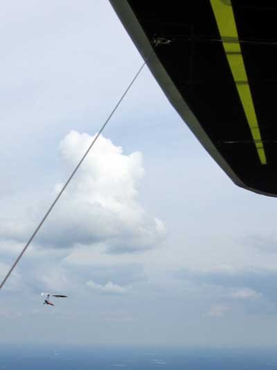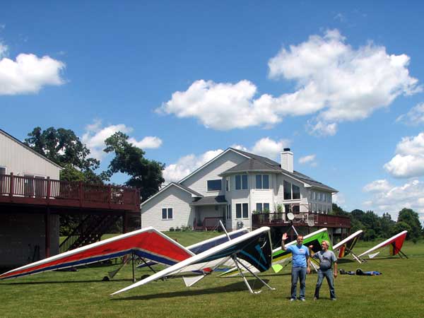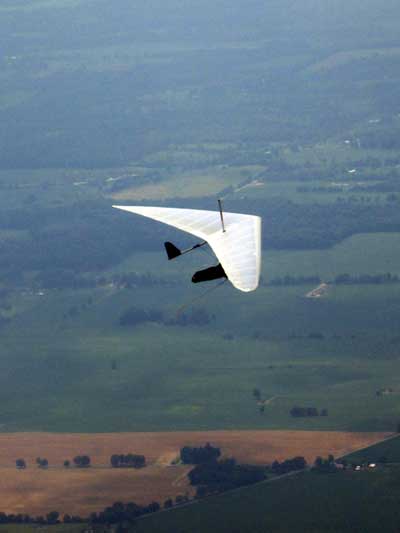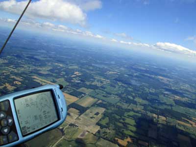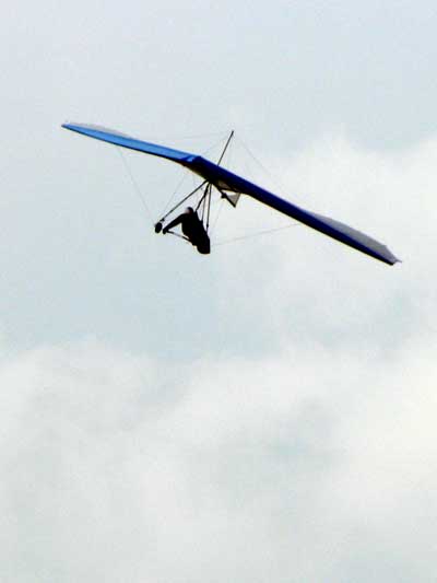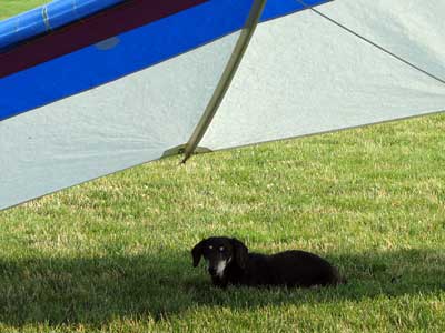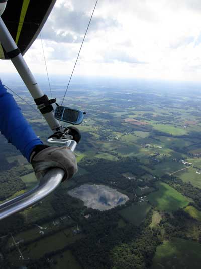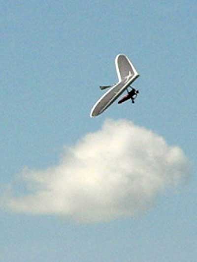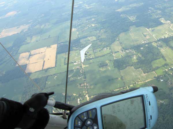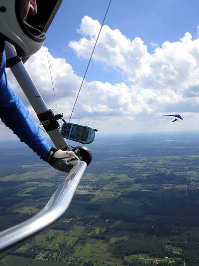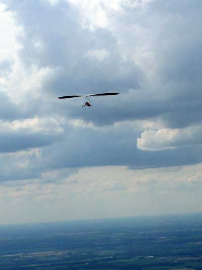 The Skydog Report Wednesday September 3rd Patrick O'Donnell and I heed for Cloud 9 as the forecast says sunny and warm. We get there at 11 am and Tracy is rolling the field and we set up. Soon Tom Niblock and Brian Deimling drive in. A little later Bernie Spring and Bob red show up so we have a good group to fly with. Lisa come in around 2:30 and gets into the air Quickly. The rest of us had already taken flights and I lasted for 54 minutes and the others had 45 minute flights. Lisa blows us away staying above 4,000 feet for one hour and thirty one minutes. For most of us it was a struggle but Lisa made it look easy on her new Litespeed. We all tried a second flight but I only lasted 25 minutes on my second flight. On my first flight I had got up to 3,671 feet. Lisa's highest was 4,650 feet. Not a stellar day but well worth the drive for us. |
