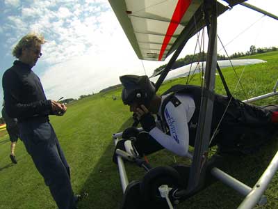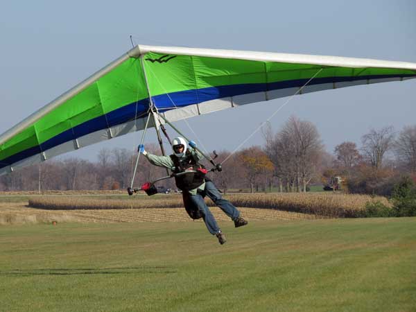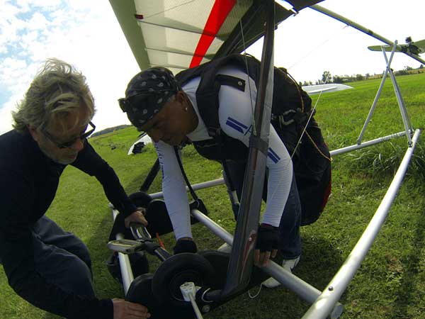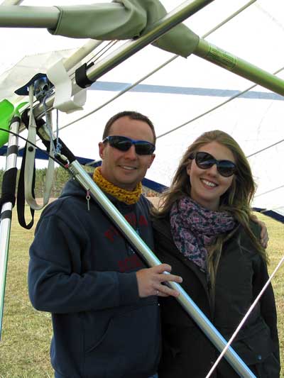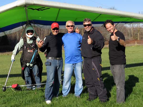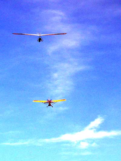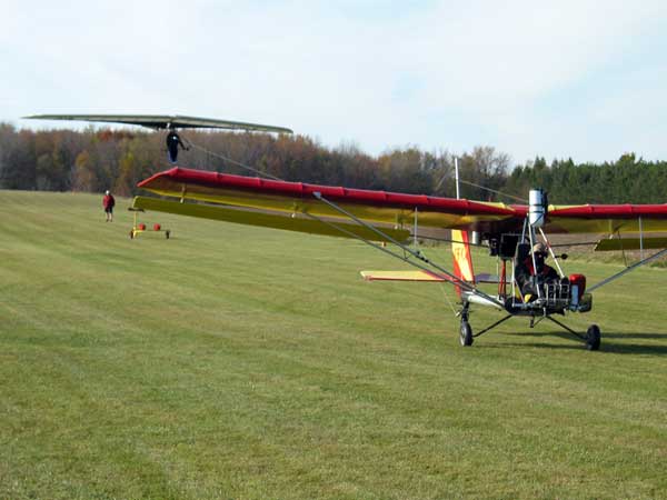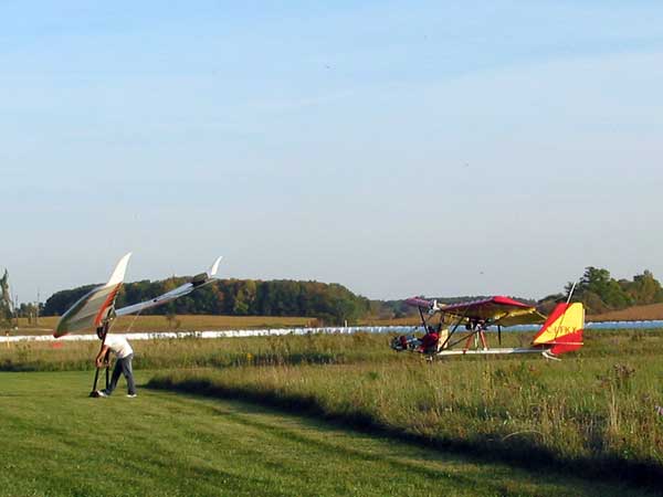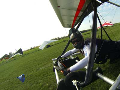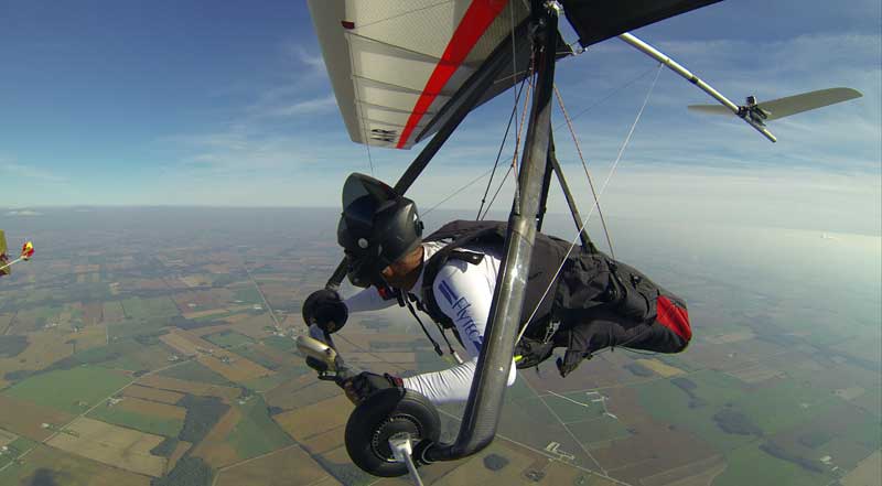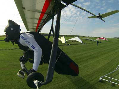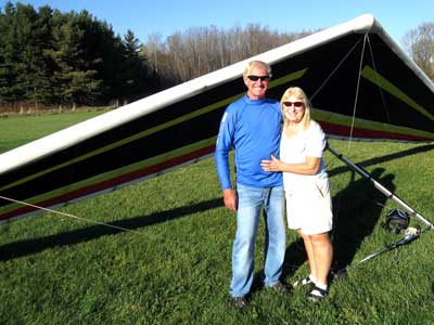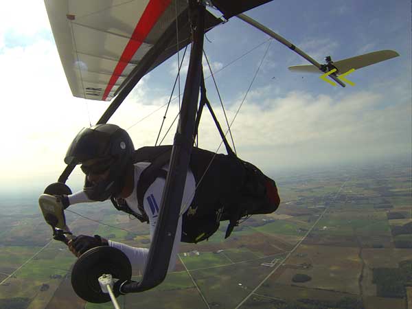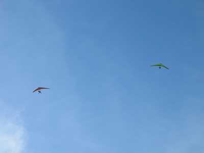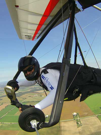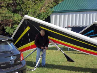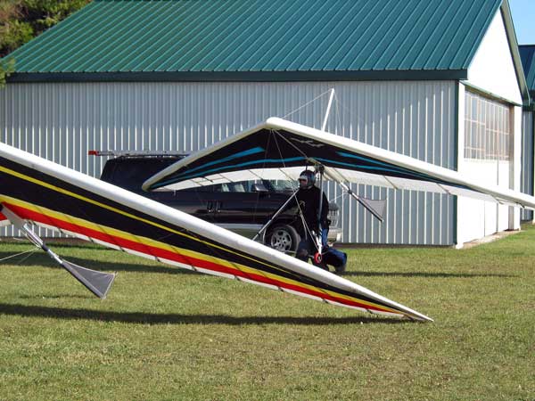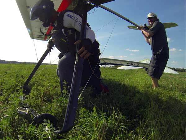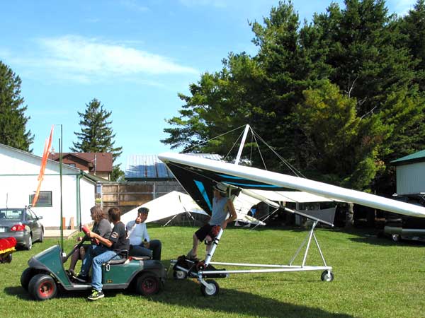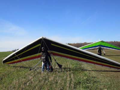 The Skydog Report September 25th 2015 Patrick O'Donnell and I went to the TOGA field called Palmerston Airport where ten local pilots assembled for a day of promising good thermals. Martin McCloud operates the aerotow operation there and James DeHart was our tow pilot for the day. It turned out that the day had no cumulous clouds and some high overcast but James towed twenty three flights to various heights up to 5,000 feet. Grazi Meil and Tim had their Atos gliders set up and ready to fly by noon along with lots of flexi pilots. Most pilots took two or more tows and the lift was scattered but later on around three pm there was an area of lift to the southwest of the take-off that got some of us up to over four grand ato. Patrick and I got into some good stuff that took us to 4,200 feet. The strongest lift was around 600 feet per minute and an unbelievable stench was in the center of that big thermal. There must have been a farmer spreading pig manure below as it was almost chocking but the lift was really good. I think that Patrick said he got 45 minutes and I got 54 minutes trying to stay up for an hour but I did not want to get to far from home base for a landing. The Big Winner for the day was Mark Dowsett who came in late and took of shortly after my last take-off at 4 pm and Mark went down wind for a flight of forty miles and stayed aloft for two hours and ten minutes. Congrats to Mark. My first two flights were 26 and 30 minutes. It was great meeting some new pilots and flying with my old buddies.