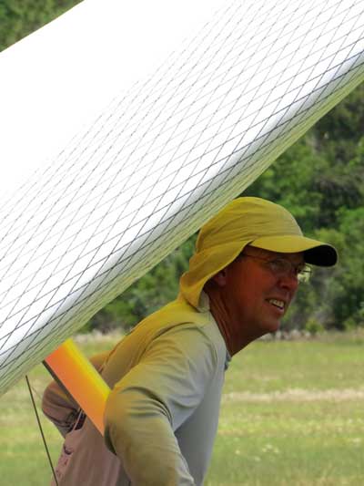 The Skydog Report Wednesday April 13, 2016 and another sunny morning with lots of tandems and Wills Wing Demo flights. These new gliders look spectacular with the clear sails. Thermal pilots start getting into the air after breakfast at 11:30 some with Demo gliders and lots of others also. Steve Pearson was nice enough to test fly my T-2-C and tune it a bit and now it is so sweet. I got in line around 1 pm just at the wrong time as the sky had just overdeveloped and everyone was sinking out and my flight was only 16 minutes. I tried again at 2:30 pm and was able to survive for 33 minutes and got up to 3,400 feet and sunk out again. There were four gliders left in the air and two of them were JK and Rick Bremer on their Atos gliders and then there was Mark Bourbonnais and one other flexie pilot who survived the big shut down. After lunch close to 5 pm a few of us tried again and there was not much lift so I had a 14 minute sledder. JK and Rick Bremer had three hour flights with the top of the lift at 3,700 feet. I think that Mark and the other pilot landed shortly after JK and Rick. Mick Howard flew from Quest Air to Wallaby Ranch and it took 3 hours so slow going but at least he made it. That shows a great deal of persistence and smart flying technique. Jimmy is stoked after five days straight with over 2-1/2 hours each day. He is bouncing off the ceiling with joy. |
