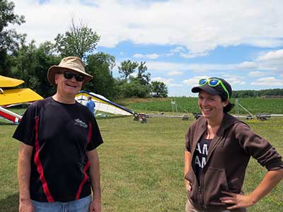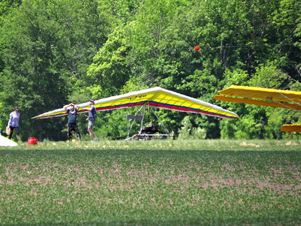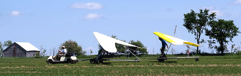 The Skydog Report Friday May 6, Patrick O'Donnell and I drive to the SOGA field near Orangeville, Ontario, Canada and meet up with eight pilots from the local area. The forecast wind was to be 9 mph but when we arrived at 10:30 the wind was a disappointing 15 to 20 mph. The wind drops off by noon to 12 mph and Rod Reiger gets towed by Gary first and breaks off early and lands saying that it is pretty bumpy. Ken Kinsey takes a tow shortly after and hangs on up to 2 grand and works the lift to over five grand and heads downwind for a flight of 35 miles landing close to Mitchell, Ontario. Mark Dowsett takes off next and takes the lift downwind about 18 miles. Around two pm. Gary tows me up and I find lift shortly after releasing upwind of the launch and I work it up to over 5,300 feet getting downwind about two miles and then work my way back to launch finally getting down to 600 feet and ready for a landing approach when I bump into a thermal just above the tree line on the edge of the landing field and it really turns on with my averager reading 800 feet per minute. Wow, this is fun and I take it up to 5,976 feet ato. Rod tows up again and is working below me at 3,500 feet and takes off downwind for a flight of 36 miles. I was trying to get over six grand but did not quite make it so I headed back to the field not finding another climb and landing with a flight time of 1 hour and 20 minutes. Les Tapol took a flight later and pinned off early for a short flight. Steve Younger took his first aerotow flight in five years on the glider rather than towing us in the Dragonfly. Steve will be thermalling with us now that we have another tow pilot. Patrick decided not to fly today and helped with launches. |