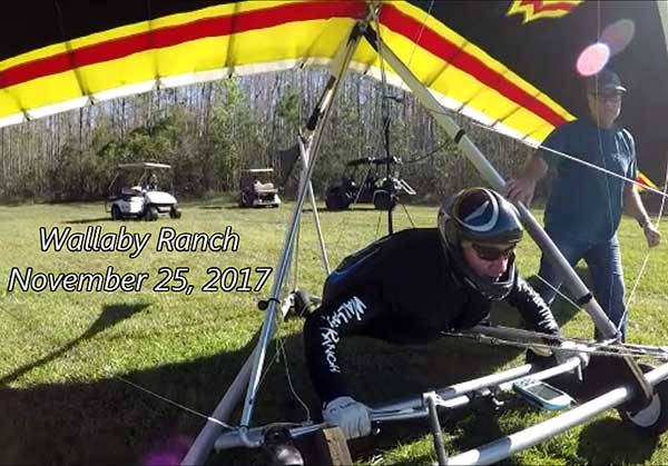 The Skydog Report Saturday November 25, 2017 and we have a blue sky and about ten pilots ready to get airborne. I get off in third place and the lift is space and I have some fun trying to stay up. Cory Barnwell was first off and had a nice one hour flight. Sugarman flew his new Moyes supership and was thrilled with the performance. As the day wore on the lift got lighter and by three o'clock it was all over. My first flight was 22 minutes and my second flight was 28 minutes and I topped out at 2,800 feet. It was very challenging and I enjoyed the challenge. Sunday November 26, 2017 and another blue sky day and we have a larger crowd today. Cory Barnwell and Niki Longshore are of early and show us the good spots. George Adams and Oded Kalir have good flights today and Oded spends over one hour in smooth lift with Rick Bremmer who had the longest flight of the day with over 2-1/2 hours. Oded got up to over 3,200 feet ato. I get off about fifth today and find decent lift but I see an inversion layer below 2.500 feet so I don't expect to much. My first flight lasts 48 minutes and my last attempt was only 19 minutes. Greg Linneman was often high and the thermal spotter for me today. Moritz Wagner also had a nice one hour flight today. Monday November 27, 2017 we have yet another blue sky day and about six of us get airborne after 0ne pm. I was first of followed by Moritz and the Rick Bremer and then I think it was George Adams up next followed by Oded. I didn't see much of most pilots but Moritz stuck pretty close making for some good video shots included in our November 27 Video. Mark Johnson dropped me off in some light lift over the warehouses and I bobbled up and down between 1,500 feet ato and 2,600 feet. Moritz joined me and we worked together for about a half hour getting pretty close sometimes. Finally the lift appeared to better over the orange groves and Moritz went west a mile or so climbing out real nice to about 3,200 feet while I did not notice that he was gone and by the time I saw Moritz I did try to chase west but I got to low and then by the time I got back upwind to the landing field I was to low to catch a thermal back up so I landed after one hour and six minutes. The longest flight of the day again by Rick Bremer with one and one half hours. I think Oded got the highest anyone did and was up to 3,700 feet ato. so it was a pretty good day with lots of happy faces in the landing area. I took a second flight after 4 pm but it only lasted 19 minutes. Tuesday November 28, 2017 we have a bit more wind that we like and around 4 pm Moritz and I decide to take a flight. We could see a bank of cummies getting closer but we were not able to get to them. Fay Barber towed both of us over the warehouses to the east and from there on it was all down hill in smooth air. Moritz squeaked out 21 minutes while I landed with 19 minutes. Wednesday November 29, 2017 and finally we have some puffy clouds coming through the area but the wind is a little strong like 15 gusting to 20 mph. Around one o'clock Moritz, Oded and I decided to go for it. Mark pulls me up first and drags me to a nice cloud about three miles south of the Ranch and it is a boomer. I ride this baby like you would not believe and follow it south west over the orange groves where I stumble across six vultures circling and I join in the fun taking the lift up to 3,700 feet ato. After this bit of fun I decided to head east to over the warehouses to see if there is anything left over there. When I get almost to the warehouses I see another gaggle of vultures with white wingtips and I play with them for a few minutes. Now I go searching and as often happens I don't find anything and have to land with a 42 minute flight. OK and now for another try at it and this time Oded Joins Moritz and I. We did not get very close today so not much video but we had lots of fun trying to stay in the lift. Same old thing and I am on the ground in 34 minutes so let's try again as the sky looks so inviting and Mark pulls me up high but by now the lift had all but died and I got a 28 minute flight. You might say it was not a great day but I still enjoyed the challenge of staying aloft and safe landings. Thursday November 30, 2017 A foggy morning but by 10 O'clock the tandems are flying and the sky clears. By noon the cummies start to form nicely and by one pm. we form a line of eager pilots ready for a skyout day. For a change I let the others get airborne first as I want to get photos of the others taking off. Sugarman gets off first and does not stick. The eight others got off and Sugarman went again and everybody found good lift. Jason Williams had a good flight for his first attempt after his eye surgery. Rick Bremer as always had the longest flight of three hours and forty-five minutes. Oded had a great flight also with three hours and fifteen minutes and most got up to five grand. I was a bottom feeder today and got up to 4,030 feet ato with a 48 minute flight. After I was in the air for twenty minutes my top zipper slid down and apart leaving me feeling uneasy so I was no my usual go for it guy. George Adams was cloud dancer today and Moritz Wagner did very well getting to 4,387 feet ato. Lots of smiley faces in the landing area after an exceptionally good day. Pics coming soon. Friday December 1, 2017 Another great day at Wallaby Ranch. The day starts out with blue skies and lots of tandems early. No cummies at one pm so we get ready and give it a try by two o'clock. Greg Linneman was first off and I went second as we could see some cumulous formation in the distance. Greg was getting really high as I dropped off at 1,700 just after going through some great lift and I came back but stumbled around looking for it and finally I was down to around a grand when I found a line that was going up just southwest of Wallaby Ranch and I was able to stay with it up to four grand. Moritz and I circled together for a while and got a few good shots with t