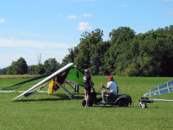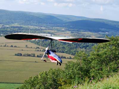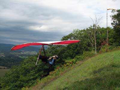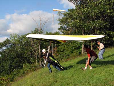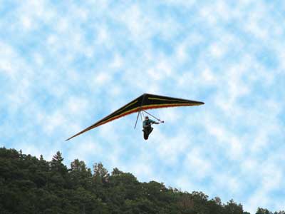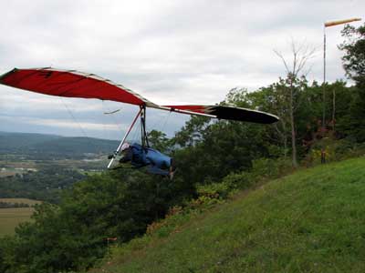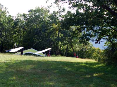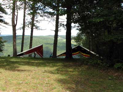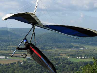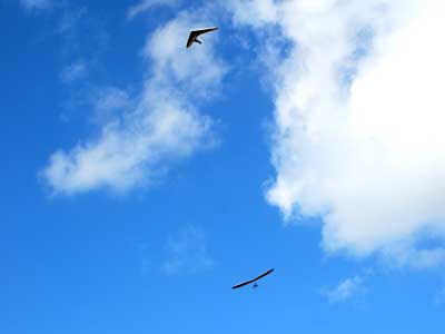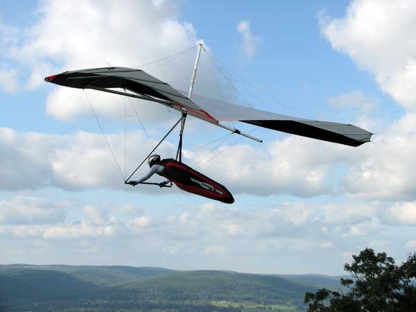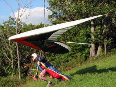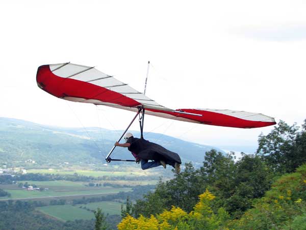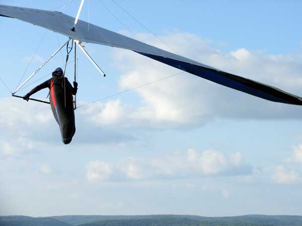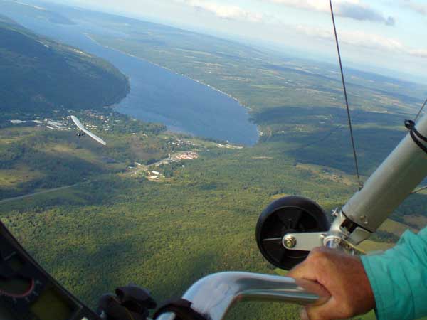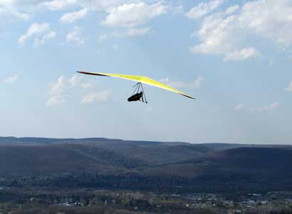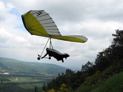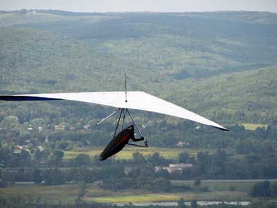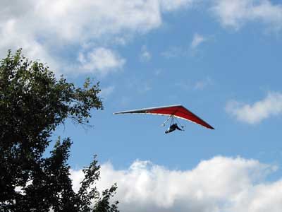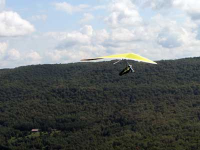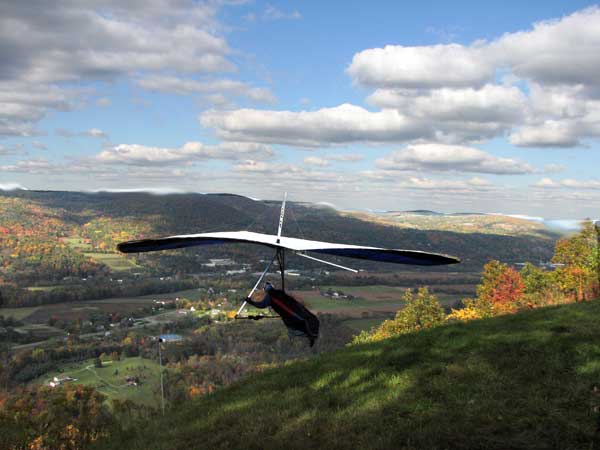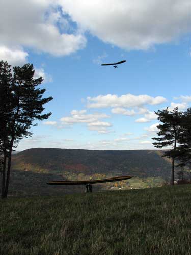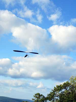 A Sunny Week in the Finger Lakes of New York September 13 - 19, 2009 Sunday September 13, 2009 we arrived at Hammondsport by noon and set up and flew with Moritz Wagner, Rick Brown and Dave Stuckey. Conditions were strong and a little crossed from the west. Moritz landed on top after 45 minutes and Rick and Dave followed a few minutes later having great landings. I hung in there for one hour and forty minutes having about twenty minutes of enjoyable air and the rest was work and scary although I did get up to 2,050 feet. My landing did not work out very well as I worked my way down to the Church landing field in strong lifting conditions and finally flared and my left wing got lifted and I spun around and broke a downtube but glad to be on the ground and not injured. Scott Wise, Carl, Katrin and Doug flew later and had better flights but they reported that it was still bumpy at 6:30 pm. Monday we hooked up with Scott Wise and went to Harris Hill. Mark Frutiger, Ed Jowett, Ron Kitridge, Jimmy Kolinich, Doug Stoner and Doug hg flew with us. With the wind still coming from 310 degrees and Harris gave us good air and I got up to 1,000 feet over take-off and flew for one hour and six minutes and then the wind slowed and started coming from the west so we landed in the great landing field at the bottom. Mark was testing a used Aeros Discus that he acquired in Florida and it went very well. Tuesday the wind finally came around from the NW so Scott and I headed up to Hammondsport and had great flights and I got up to 2,550 and could cruise around the beautiful skies above Kueka Lake for one hour and five minutes and we both landed on top having good landings. Wednesday the wind was coming from the NE so along with Scott we headed for Indian Cliffs as the wind was light. When we got there the wind was coming straight in and the sock was straight out so we quickly set up and I asked Scott to test the air and he got off and above about three hundred feet so I waited a few minutes and twenty minutes later Scott was sinking out and landed. I decided to break down rather than a sledder. Thursday the wind was from the SE east and not very strong so we decided to go to Italy Valley for a hike and Scott did not bring his glider and when we got there the wind was straight in at twelve mph so I quickly set up and got into the great air and after about twenty minutes I got below take off about one hundred feet but I found a great thermal to the south and took it up to 1,400 feet while Maureen and Scott and the dogs went for a walk in the woods. After fifty tree minutes I got flushed but it was a fun flight and I could see Canandaigua Lake from 1,000 feet. Friday WNW winds again and partly cloudy skies forecast so off to Harris Hill again and it was honkin when we got there so we set up and I got into the air first and found that the air was smooth and very enjoyable. Scott came up shortly after and we cruised the ridge for a while at about 600 feet ATO then Bill Vickery showed up at 2 pm and got up with us doing some wild wingovers right after take off. Scoot had to leave early so he landed after one hour and Bill stayed up with me for a couple of hours and my flight time was three hours and fifteen minutes and my highest altitude was 1,400 above take- off. Shortly after take off the sky clouded up but it stayed soarable. It was great fun flying to the west over the sailplane runway where three sailplanes were being towed up. I had a great landing on my wheels. Saturday the forecast was for NE winds but light so we went hiking and Florian and lots of others went to Indian Cliffs and had many great flights and the RAF had their student graduation party at IC. |