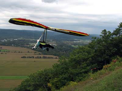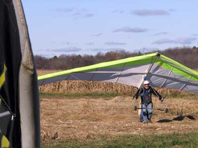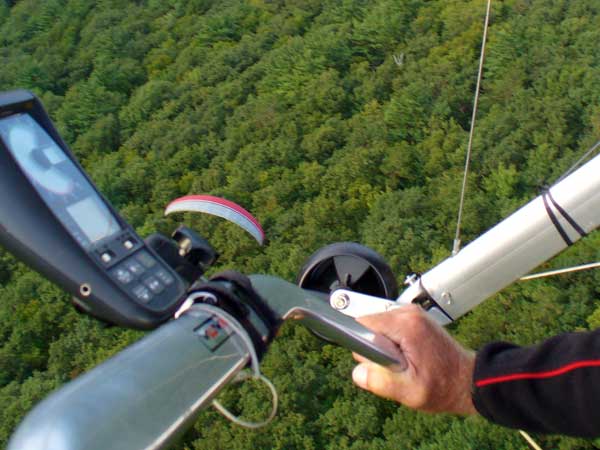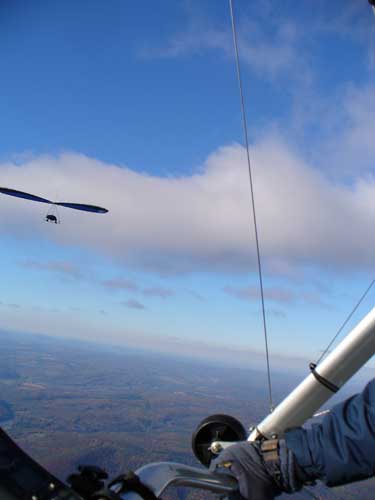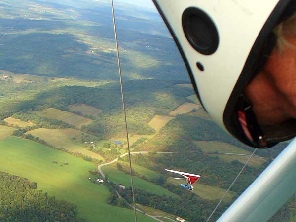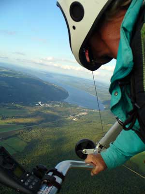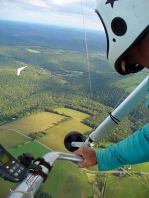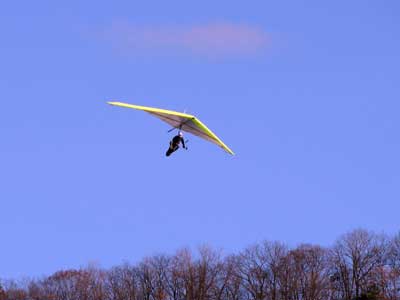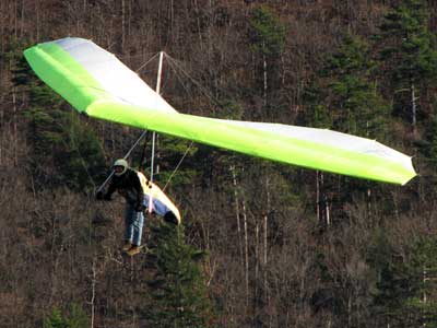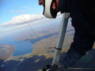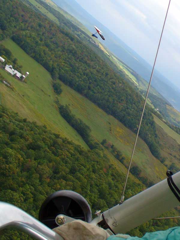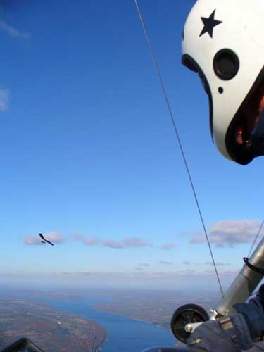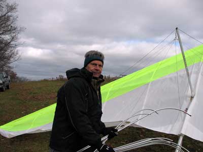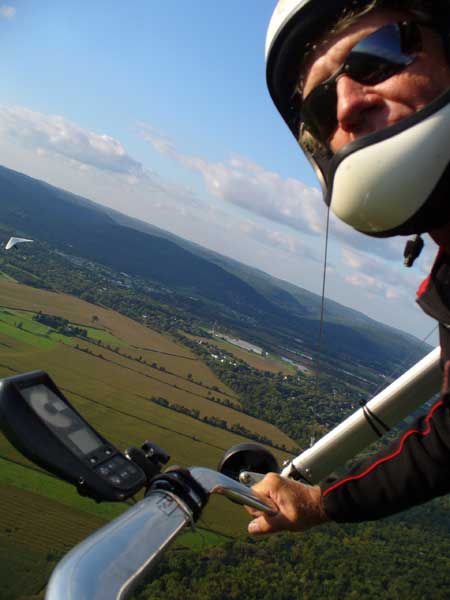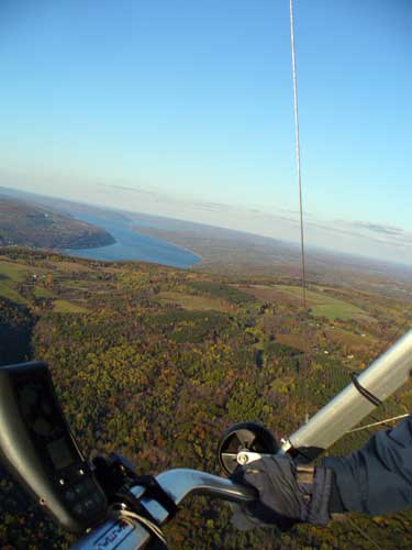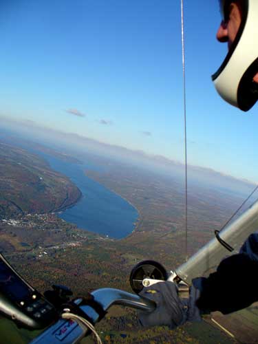 Three Days In the Finger Lakes Sunday October 18, 2009 Watching the forecast for quite a while we finally decided that there looked like a break in the bad weather of this past summer and headed to the Finger Lakes and specifically Hammondsport for a Sunday Hang Gliding Encounter. We arrived about noon and the wind appeared to be coming straight in on launch so I called Mark Frutiger and asked if he would be coming to H-port and Mark promptly dropped his paint brush and headed down. As I was setting up Jeff Ingersol drove in and shortly after Mark got there. I was set up first but had noticed that the wind occasionally came from the right on launch and I have been eaten by the trees when this had occurred before so I was waiting for Jeff to go first and after an hour of waiting Jeff got his harness on and made a good take off and climbed pretty well so I got my harness on after watching for a few minutes and seeing Jeff get about three hundred feet above take-off and then it happened the sock started coming from the right again and Jeff sunk out so off came my harness and I waited and watched the sock while Mark was setting up and it seemed that it was almost straight in at about 8 mph most of the time so I finally hooked in again and made fair take-off with one wing lifted some by looking at the photos later but anyways I got off safe and slowly climbed up to about 300 ATO and back down to 100 above and back up to 300 a few times. Then I found an area just to the right of launch that seemed to be lifting more consistently so I went to that area and headed away from the slope and my vario kept beeping even as I was about 400 feet for the ridge so I started circling and wow, the next thing I knew I was at 3, 500 feet above take-off and back over Paroulski's farm so I was feeling real good about it all. About this time Mark got off the slope and climbed out nicely and the next thing I knew we were circling together and I was shooting photos of Mark on his Aeros Discus. Mark is saving his T2C for the comps. At one point I lost view of Mark and the next thing I knew he was high above me in a great thermal so I joined him again and we had one of the most wonderful flights of the summer. Later in our flights there seemed to be lift really everywhere like a wonder wind but everywhere rather that just in the valley, Finally after one and one half hours Mark decided to land back on top near the road and I watched him, it seemed like forever back there circling and circling and it looked like he would never get down but finally he got down to where I could see his shadow and Mark landed nicely. Well, now I thought, darn it, I would like to fly a bit longer but it is not so much fun flying alone so I played for a while flying here and there not finding much sink anywhere so I finally thought that maybe if I flew across the valley and a way up the far side that I might find some sink but as I reached the pond just before Mitchellsville I realized that there was no sink to be found so I flew back across the valley and over launch and I had not lost more that 200 feet and was still at 3,200 feet. OK so I am thinking that I should land now before Mark gets packed up so I head back behind launch and beyond the road and it is really unbelievable to me that there is still so much lift back there that it is hard to find any sink so I play in the lift for a while and then I see my Honey (Maureen) driving our van back there so I do lots of fast turns and wingees and finally get down to about 400 feet above the top landing and finally there is no lift so I can slip in for a nice landing. Oh, by the way my highest height attained was 4,020 feet above take off which was cloud base at 4 pm and my flight duration was 2 hours and thirty minutes. I truly have never had such a nice flight in my 37 years of flying and I wish that all you other RAF pilots were there. Monday October 19, 2009 The forecast was for light winds in the west southwest direction which took us to Katie Did, a site just past Elmira NY. In my years of flying, I have not had many good flights there but likely five times I have done OK and only once did I have a good gain of 2,500 feet many years ago with Wayne Berman and Keith Riemersma from Michigan. OK so Monday we got there by two pm and the wind looked straight in and at 10 mph. Could not be better but by the time we set up it was falling to 6-8 mph and Doug Stoner took his paraglider up and it looked promising but Doug was not getting very high like 300 ATO and then after about twenty minutes Doug went to the landing area. Next Ed Jowett ran off and had a few good passes and landed. Next Scott Wise got off in a poor cycle and sledded to the landing. A half hour later Linda Salamone took off in a better cycle and I knew it was time to go for it and I got off and enjoyed some ridge soaring with Linda. I think that the highest I got was 270 above take-off and that was with some pretty close scratching above the trees and my flight was 46 minutes. Ron Kitridge decided not to fly in the light conditions. Tuesday October 20, 2009 Back to KD again but this time there was a little more lift and Ed Jowett, Scott Wise and myself were able to use the thermals to get us up and Scott got the highest at one thousand above take-off while Ed and I got 750 ATO. The most fun of my flight was the three of us circling together for at least ten turns and pretty close too. It was a fun day and I logged the longest flight of one hour and fifty two minutes and that new landing area is great for my wheels. This was a great three day break for us. |