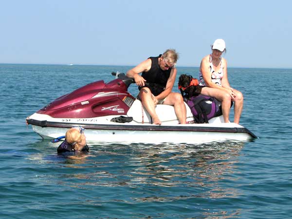 Maureen Swims and Eric and Mary on Jet Ski with Tess |