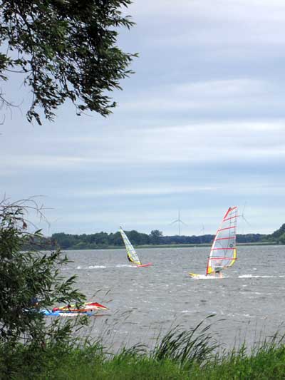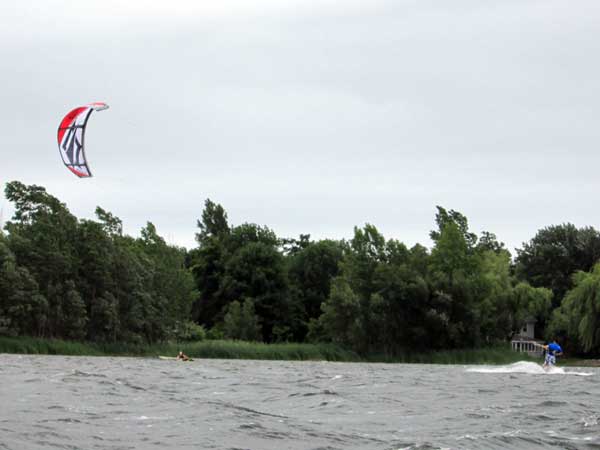 The Skydog Report Tuesday July 15, 2014 Maureen and I went to Rondeau Bay for some good sailing. We had been there on Sunday and had a good time but no photos. The forecast was for west winds 17 mph gusting to 30 mph so we were hyped. Sure enough the wind was on shore and Don Ferguson and others were on 6.0 sails cruising the shoreline. we set up the 6.0 and 6.3 sails and Maureen went out on a Roberts board that les Squires had giver to us a year ago. I went out to take photos shown below and after an hour or so I took the 6.3 across the bay as the wind had switched to Southwest and it was sweet and close to overpowered. The morning west winds were pretty gusty but the southwest later on was smooth. Lots of good sailing and all sailors were tired by the end of the day. |
