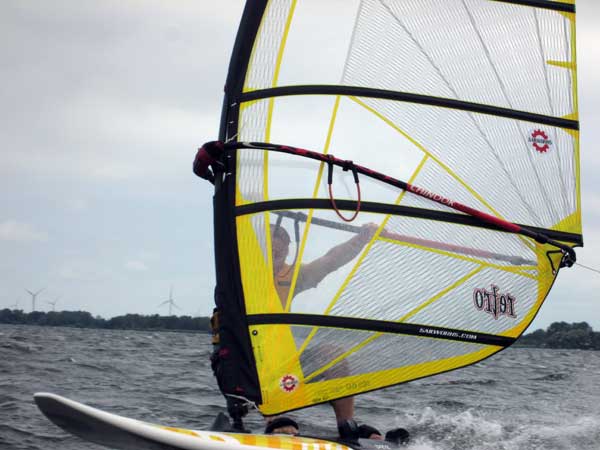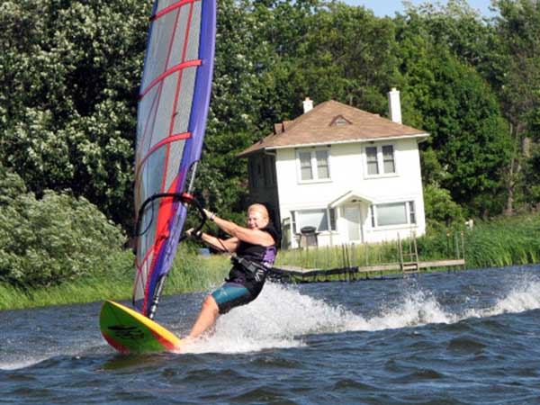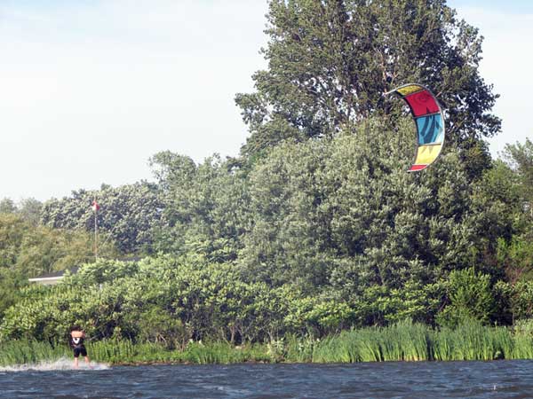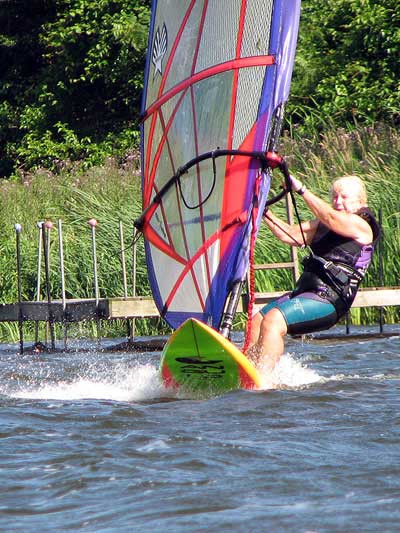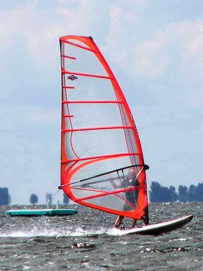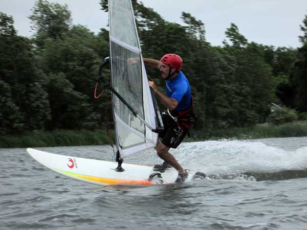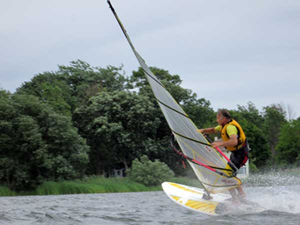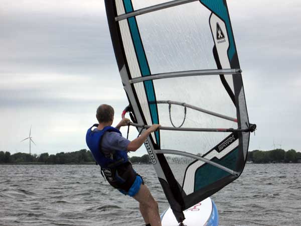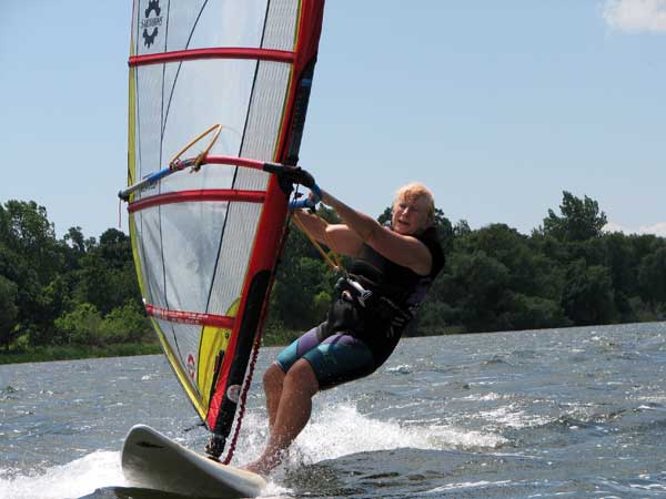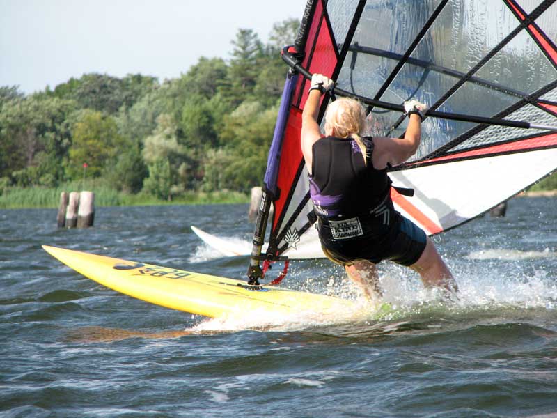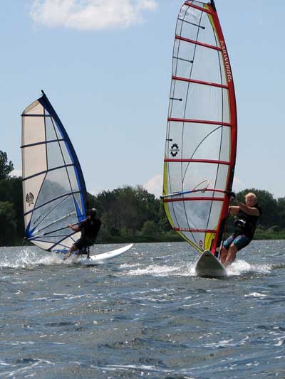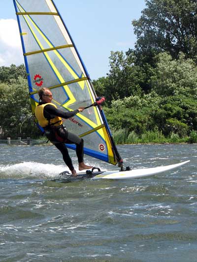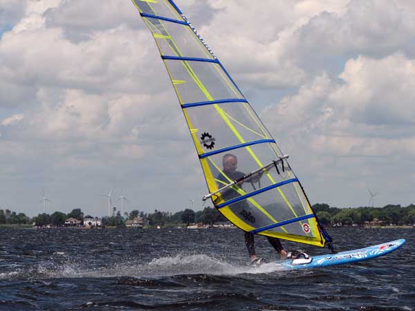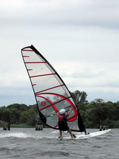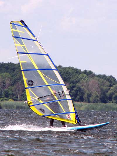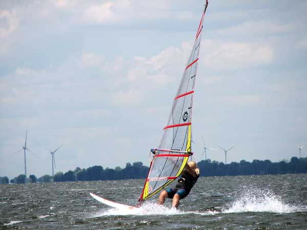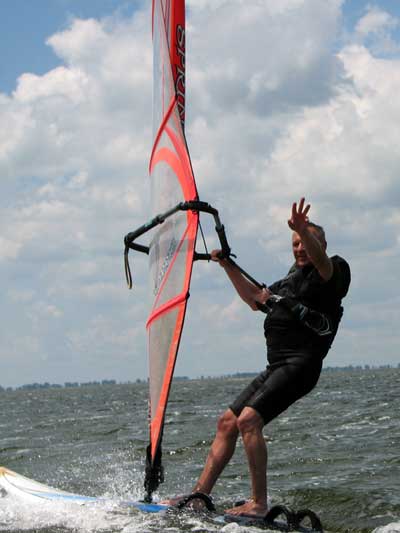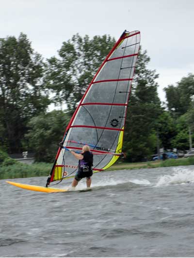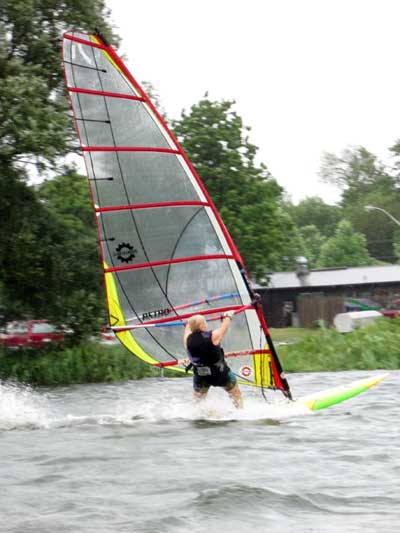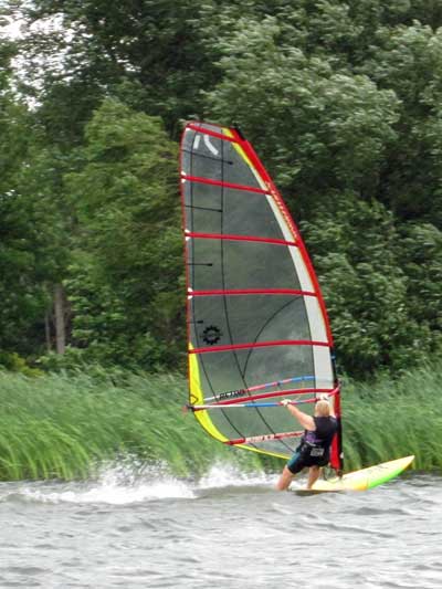 The Skydog Report Tuesday July 1, 2014 Maureen and I went to Rondeau Bay for some good sailing. The forecast was for southwest winds 19 mph gusting to 29 mph so we were hyped. I had been at Rondeau a few weeks earlier and had a few good runs and after 2 hours I was beat. Today was Maureen's first time in a couple of years and she was apprehensive but persevered and got some good practice in. Les Squires, Don and Annabelle Ferguson and others were also enjoying the great winds which finally built up to 30 mph. I took my last run at 6 pm and it was full tilt on my 6.3 Ezzy sail. |