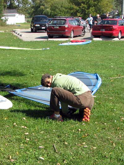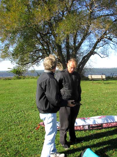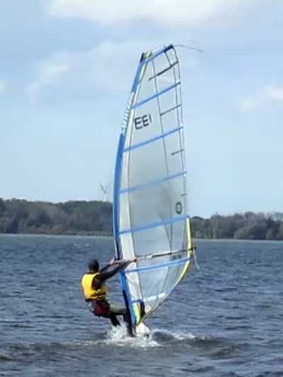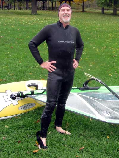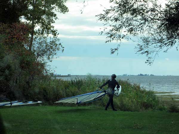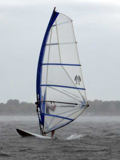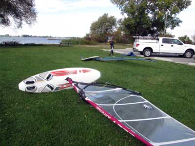 The Skydog Report Saturday October 25, 2014 The wind report was good like SW 20 to 28 mph so arrived at Rondeau at 10:30 to find I was the first but soon Rom Ossowski pulled into the parking lot. The wind looked like it would be good for a 6.0 and we set up. Ken Adderman showed up a half hour later and les Squires and Don and Annabelle Ferguson and Steve Wallace and Mereck pulled in around 1 pm. Rom and I were on the water for two hours before the rest and I did some video filming of Rom. The wind was ssw for the first hour but went to wsw after an hour or so and it was up and down but I did OK on my 6.3 Ezzy sail and Rom on his 6.0. Les set up his 4.2 and Steve set up a 6.0 and we had a great afternoon and I was filming. I have some good video of most but I seem to have missed Ken but will get him next time. I was getting tired around 3:30 and packed up as Les was still on the water having a good time. |