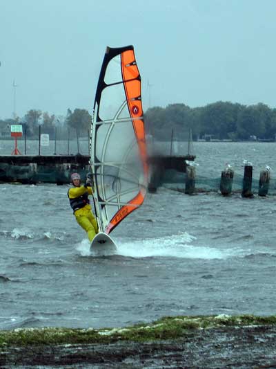 The Skydog Report Saturday October 04, 2014 Les called and said that Rondeau would be windy today so I packed up and headed out. Maureen thought that it would be to cold today. I arrived around 11 am. and found the wind was looking good for a 5.0 sail. I had Maureen's new Bic Techno 135 to try out so away I went. Les was on his 4.2 and we had a great day flying across the water. Maureen's new board is really nice and easy to sail. Ken Addeman sailed his 5.5 for at least three hours. Monday October 06 looked good again and Don Ferguson was going so Les and I headed out again. I arrived at noon and the wind was very low like 5 mph and Don was setting up his 7.5. I wanted to try a new fin on Maureen's Techno so I set up our 6.3 Ezzy and around 1 pm the wind started to increase and Don was out getting some good runs but soon he came in to down size to his 6.0 and les set up his 5.0 and we enjoyed a couple of hours of hooting good wind which had switched to just west of straight south. By 3:30 the rain had started so we broke down and went home being satisfied with a good day. Les told us that Ken and he sailed on Sunday as well and it was colder. Tuesday Don sailed again and had a great day and we are going again on Wednesday so this is a five day stretch of wind at Rondeau. Tuesday and Wednesday reports above. |