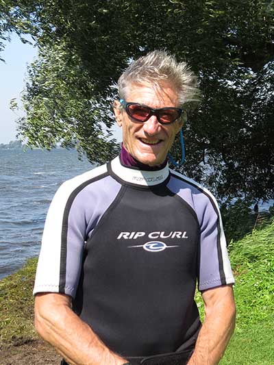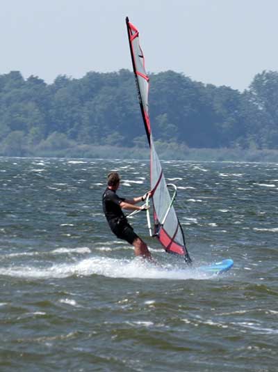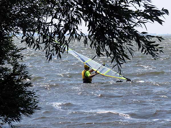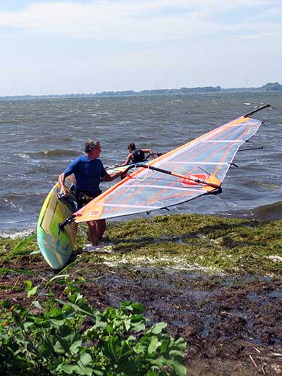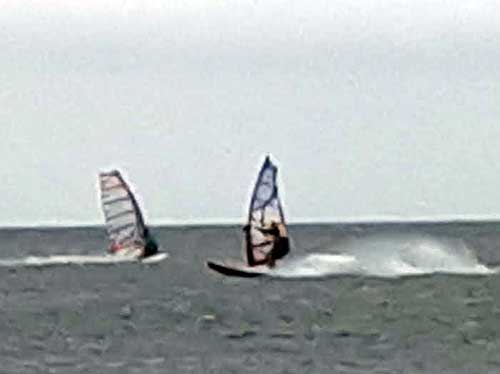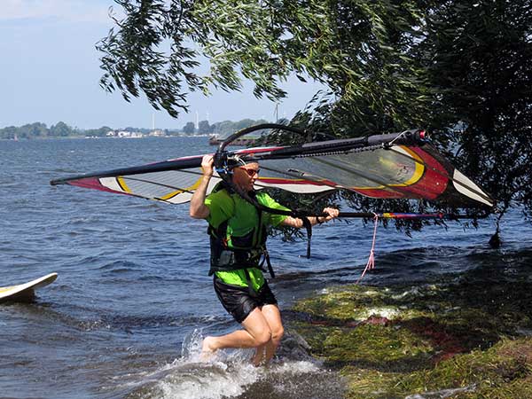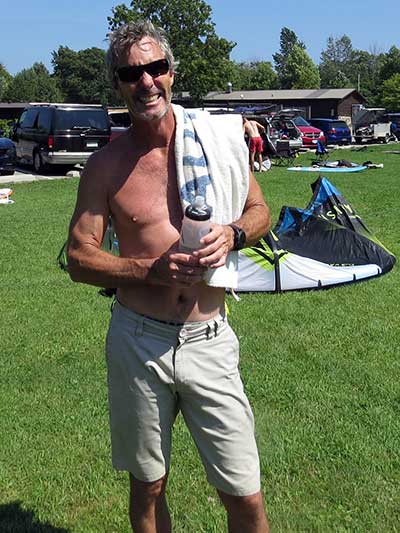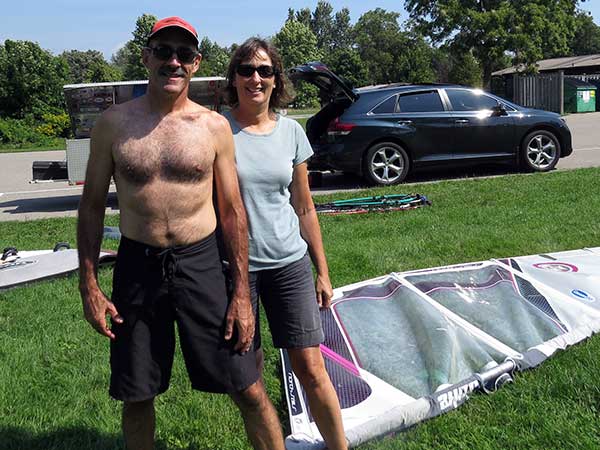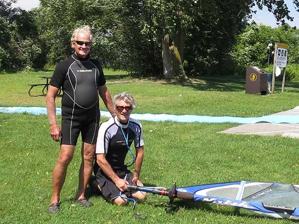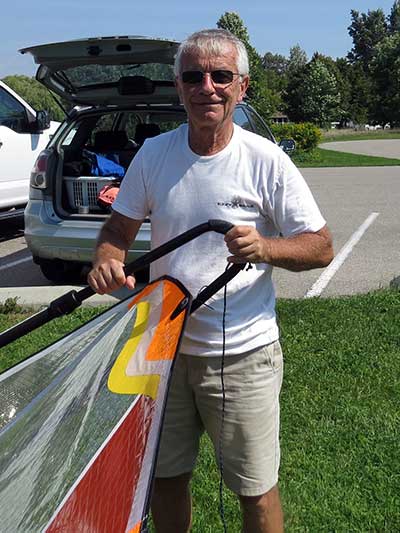 The Skydog Report Tuesday August 28, 2018 Rondeau Bay and away we go. I arrive at eleven am and the parking lot is all but full. They tell me that it has been windy all morning. Les suggests that I set up my 6.3 Ezzy and it get right to it. Les, Don and Annabelle go for a run while I am setting up and by the time I am ready Les comes in and leads me across the bay through the weed patches. Hey this is fun and when I see Les Jibe near the far side I also try a jibe but oh no, I fall as I often do. I try a water start but my knees are not co-operating and I try and try again with no success. I finally give up and les has been waiting close by and says he will drive around and pick me up on shore so I swim with my equipment to shore and after fifty minutes I finally climb up onto shore with Les's help. We get back to the set-up area and Les sets up a 4.7 sail and goes out into the great wind. I pack up and head home. I just don't have the required strength any more. I will try to get in shape for next year. See Ya then. If You Can Help with the Captions email