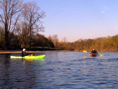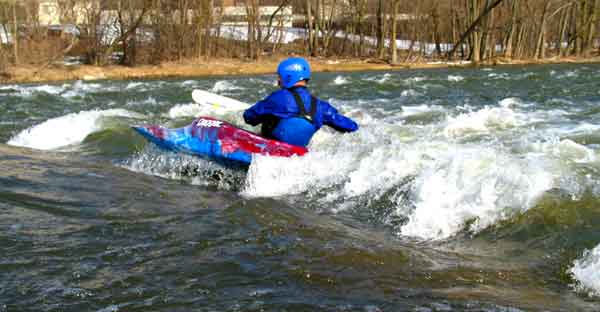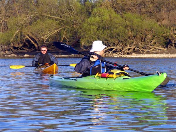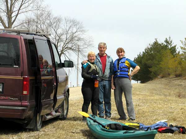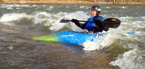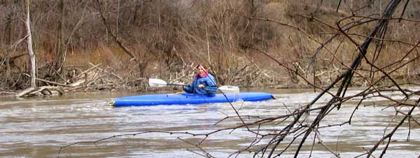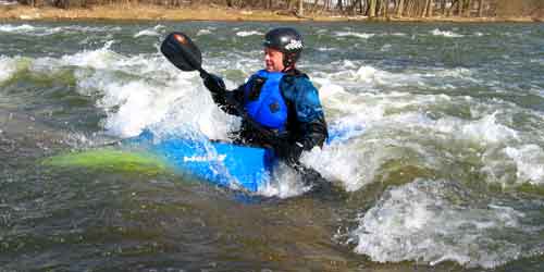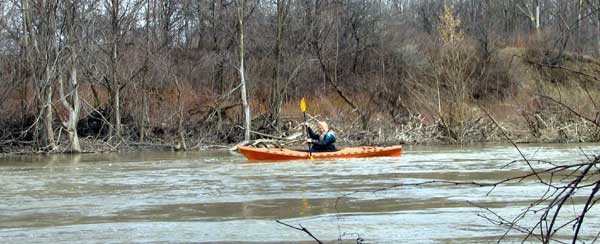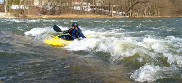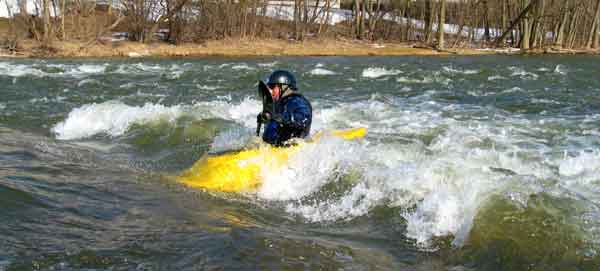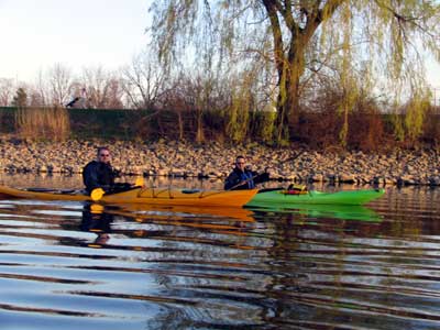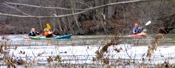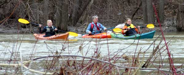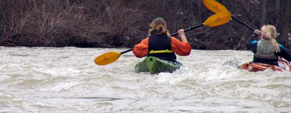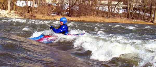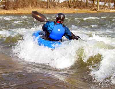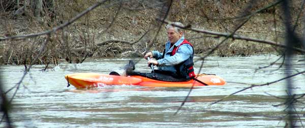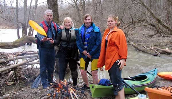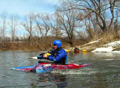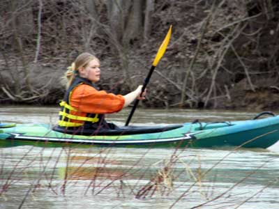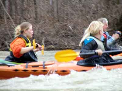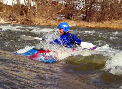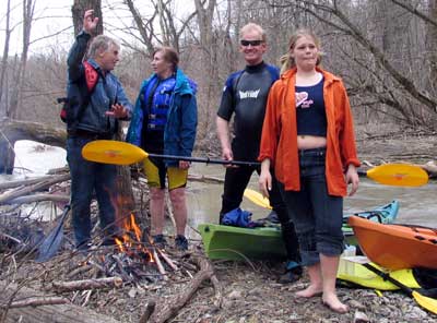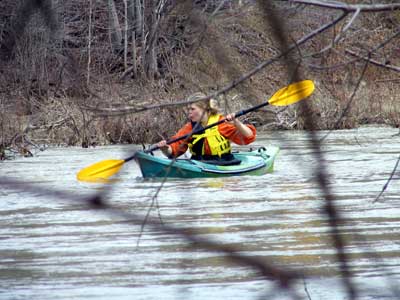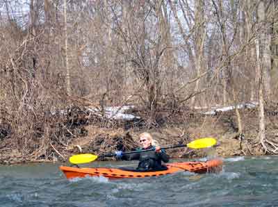 What a great day to start our 2005 season with blue skies and 45 degree F. temperatures. Maureen and myself along with Mike Kovach started at Fanshawe dam in the east end of London Canada and paddled for four hours ending up at the boat ramp at Wonderland Road and Riverside drive. During our trip we came across two other kayakers who we had not met before and enjoyed paddling the rest of the trip with Ty and Mark. The water level was about two feet above summer levels making for a good current and many fun rapids. Mike, Mark and Ty all have very short kayaks and love to play in the rapids and standing waves.