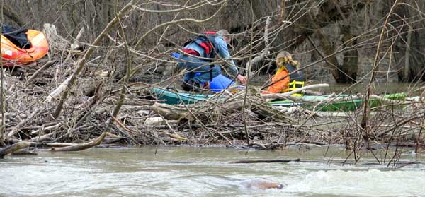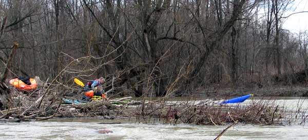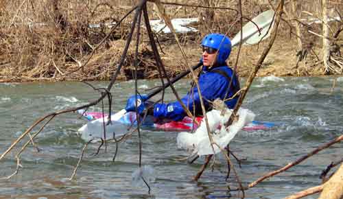 Eric Frees the Jammed Kayak and lets it go downstream to where we catch it |