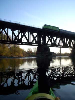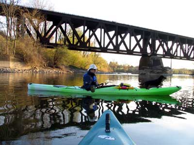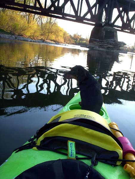 Cam Schiedel invited me to join him and Sean for their first run of the season and Sean had a new Wilderness 14 foot Kayak and he liked it very much. We paddled from the boat ramp at Wonderland and Riverside Drive up to Wharncliffe Road bridge. It was a beautiful evening and the water was lower than I had ever seen it and we were scraping bottom near the train bridge. Flash came along and took a ride with Cam and we shot a few photos which are shown below.