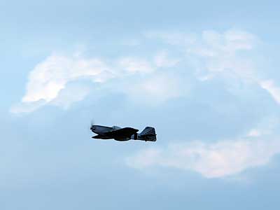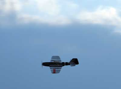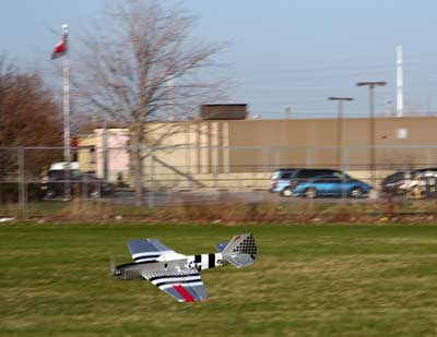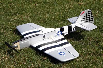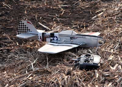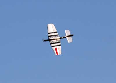 OK, so after a month of flying the scale P-51 Miss America I finally started assembly of a Fun Force P-51 profile Mustang. It took me about twenty hours being that I have not done any model building for thirty years now and my eyes aren't what they used to be. I also needed to fabricate a good mounting system for the 400 series electric motor that I was using in my Miss America so that took some time and I did not feel that the Control horns were sufficient so I installed larger ones with 1/16 plywood reinforcement under them. In the end it turned out very satisfactory. Now for the flying story, well sure enough I did it, just what I always thought I would never do - I set up the ailerons backwards so when my friend Eric launched my new bird it did something like a unexpected roll and thumped into a muddy field. Fortunately the soft mud did no damage except that the prop broke and that was easily fixed and then we had to program my transmitter to reverse the action of my aileron servo. Ok so that being fixed we tried it again and sure enough it flew although I found that it was very sensitive but I soon fixed that with longer control horns and some end point adjustments.