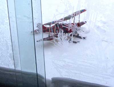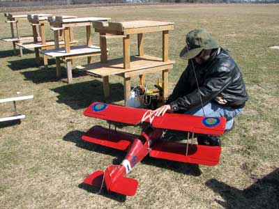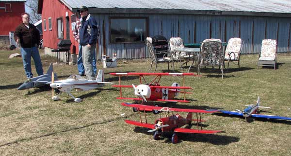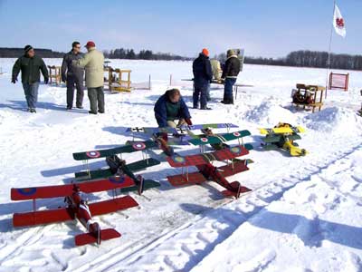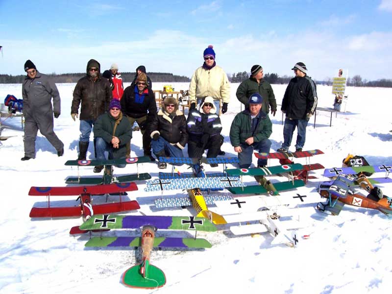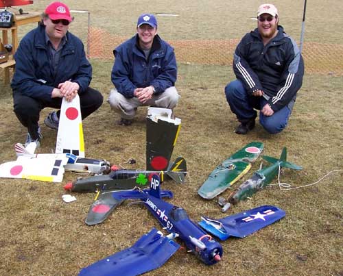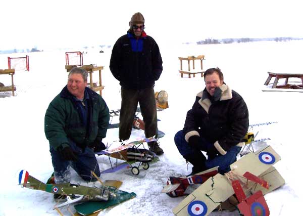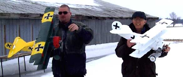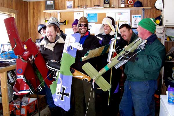 What's The Story Worst Midair ------- Boss Hog and Ice Man wiped each other out in the last round with 8 aircraft up at once. At 15 degrees below Zero we found that even the usually durable corro sometimes shatters under severe abuse . Johnny Holmes Albatross (center) --escaped with minor damage to wing covering . Best Midair is best described by Second Place winner "Bent Gary " of the Humber Valley Hawks . (roughly translated from email) An extremely bizarre midair occurred between Jeff Decalwe's SE5A and Bent Gary's DVII. We basically turned in to each other trying to get back upwind and there was a loud crunch. The models remained connected and entered a flat spin. The SE5A's prop and landing gear sliced into the Fokker's left wings, chopping off the aileron, outboard strut and a piece of the lower wing. Just before impact with the ground, the models separated cleanly. The SE5 went in hard and the DVII entered a steep turn. Gary instinctively slammed the throttle wide open... full right aileron... full up elevator. I couldn't believe the engine was still running and the airplane controllable. The DVII made it back to the field safely and after some hasty repairs in the clubhouse, flew in the next round. "Bent Gary" However -- most of the planes (not shown) went home in one piece ! |
